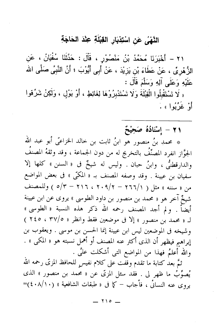21 - أَخْبَرَنَا مُحَمَّدُ بْنُ مَنْصُورٍ قَالَ حَدَّثَنَا سُفْيَانُ عَنِ الزُّهْرِىِّ عَنْ عَطَاءِ بْنِ يَزِيدَ عَنْ أَبِى أَيُّوبَ أَنَّ النَّبِىَّ -صلى الله عليه وسلم- قَالَ «لاَ تَسْتَقْبِلُوا الْقِبْلَةَ وَلاَ تَسْتَدْبِرُوهَا لِغَائِطٍ أَوْ بَوْلٍ وَلَكِنْ شَرِّقُوا أَوْ غَرِّبُوا».