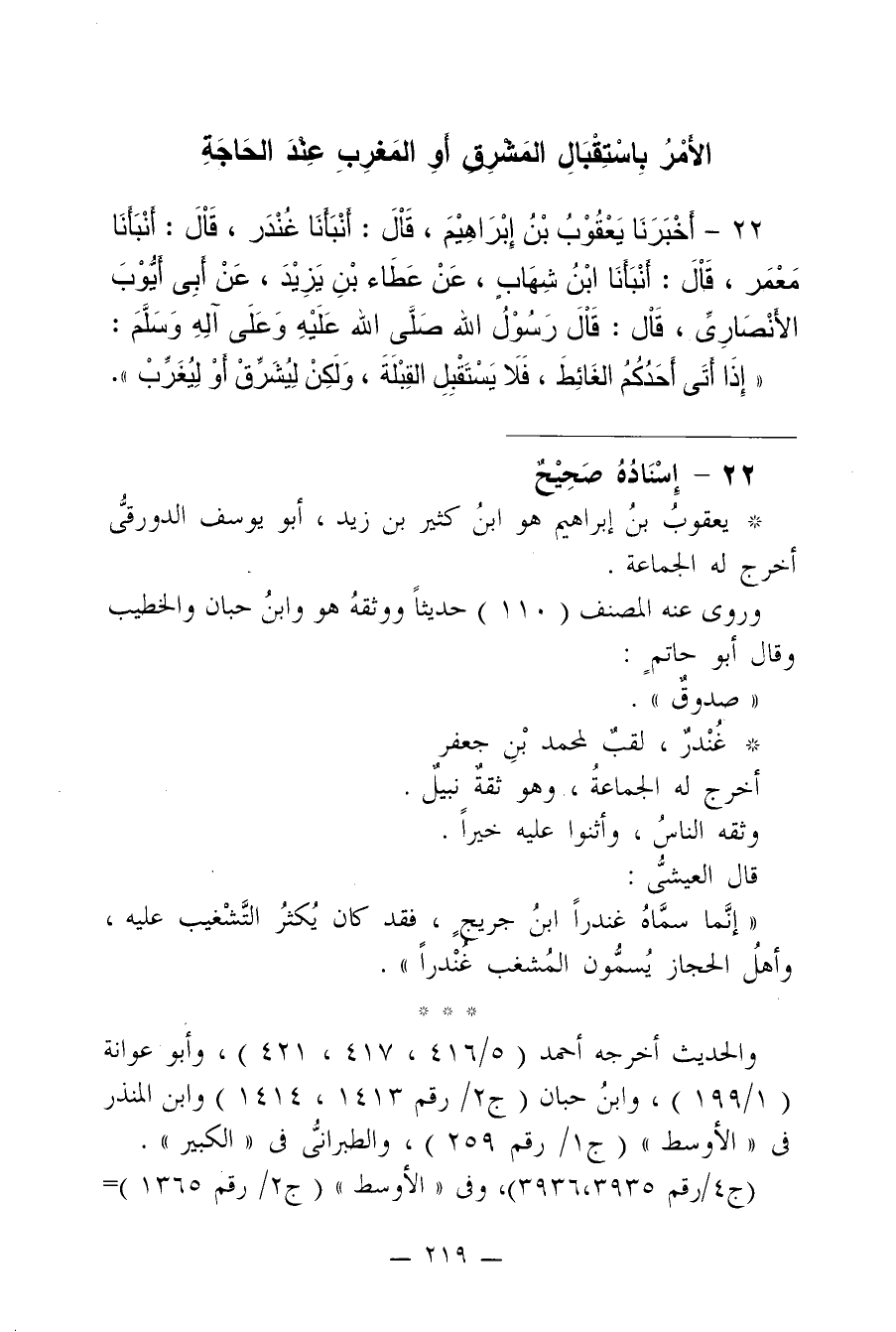 22 - أَخْبَرَنَا يَعْقُوبُ بْنُ إِبْرَاهِيمَ قَالَ أَنْبَأَنَا غُنْدَرٌ قَالَ أَنْبَأَنَا مَعْمَرٌ قَالَ أَنْبَأَنَا ابْنُ شِهَابٍ عَنْ عَطَاءِ بْنِ يَزِيدَ عَنْ أَبِى أَيُّوبَ الأَنْصَارِىِّ قَالَ قَالَ رَسُولُ اللَّهِ -صلى الله عليه وسلم- «إِذَا أَتَى أَحَدُكُمُ الْغَائِطَ فَلاَ يَسْتَقْبِلِ الْقِبْلَةَ وَلَكِنْ لِيُشَرِّقْ أَوْ لِيُغَرِّبْ».
