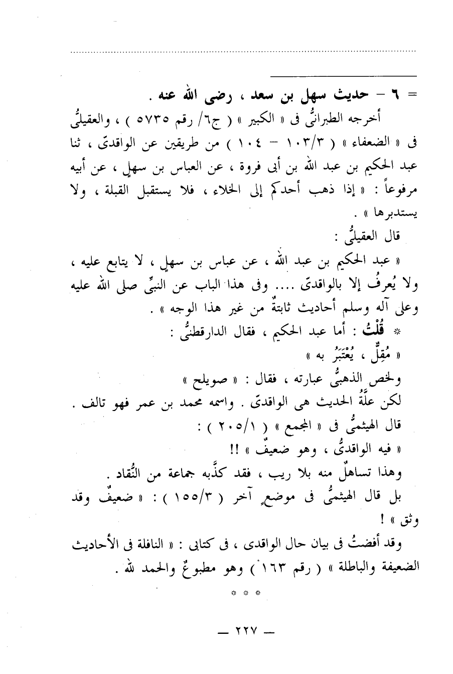 "عبد الحكيم بن عبد الله، عن عباس بن سهلٍ، لا يتابع عليه، ولا يُعرفُ إلا بالواقديّ .... وفي هذا الباب عن النبيِّ صلى الله عليه وعلى آله وسلم أحاديث ثابتةٌ من غير هذا الوجه".