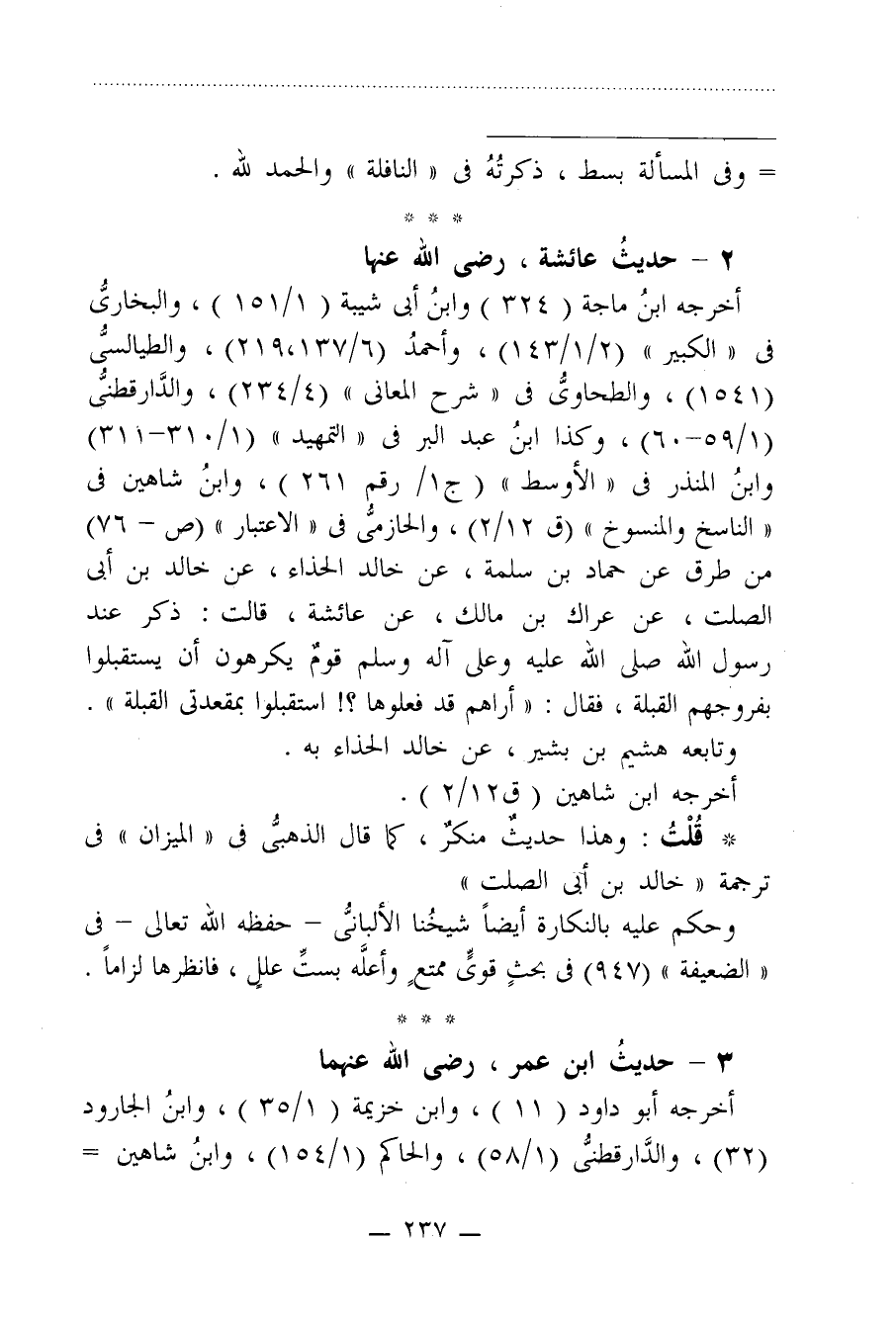 أخرجه ابنُ ماجه (324) وابنُ أبي شيبة (1/ 151)، والبخاريُّ في "الكبير" (2/ 1/ 143)، وأحمدُ (6/ 137، 219)، والطيالسيُّ (1541)، والطحاويُّ في "شرح المعاني" (4/ 234)، والدَّارقطنيُّ (1/ 59/ 60)، وكذا ابنُ عبد البر في "التمهيد" (1/ 310 - 311) وابنُ المنذر في "الأوسط" (ج1/ رقم 261)، وابنُ شاهين في "الناسخ والمنسوخ" (ق 12/ 2)، والحازميُّ في "الاعتبار" (ص- 76) من طرق عن حماد بن سلمة، عن خالد الحذاء، عن خالد بن أبي الصلت، عن عراك بن مالك، عن عائشة، قالت: ذكر عند رسول الله صلى الله عليه وعلى آله وسلم قومٌ يكرهون أن يستقبلوا بفروجهم القبلة، فقال: "أراهم قد فعلوها؟! استقبلوا بمقعدتي القبلة".