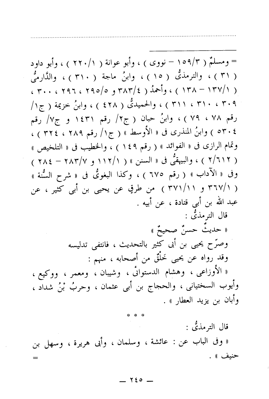 = ومسلمٌ (3/ 159 - نووى)، وأبو عوانة (1/ 220)، وأبو داود (31)، والترمذيُّ (15)، وابنُ ماجة (310)، والدَّارميُّ (1/ 137 - 138)، وأحمدُ (4/ 383 و 5/ 295، 296، 300، 309، 310، 311)، والحميديُّ (428)، وابنُ خزيمة (ج1/ رقم 78، 79)، وابنُ حبان (ج2 / رقم 431 وج 7 / رقم 5304) وابنُ المنذرى في "الأوسط" (ج 1/ رقم 289، 324)، وتمام الرازي في "الفوائد" (رقم 149)، والخطيب في "التلخيص" (612/ 2)، والبيهقيُّ في "السنن" (1/ 112 و 7/ 283 - 284) وفي "الآداب" (رقم 675)، وكذا البغويُّ في "شرح السُّنة" (1/ 367 و 11/ 371) من طرقٍ عن يحيى بن أبي كثير، عن عبد الله بن أبي قتادة، عن أبيه.