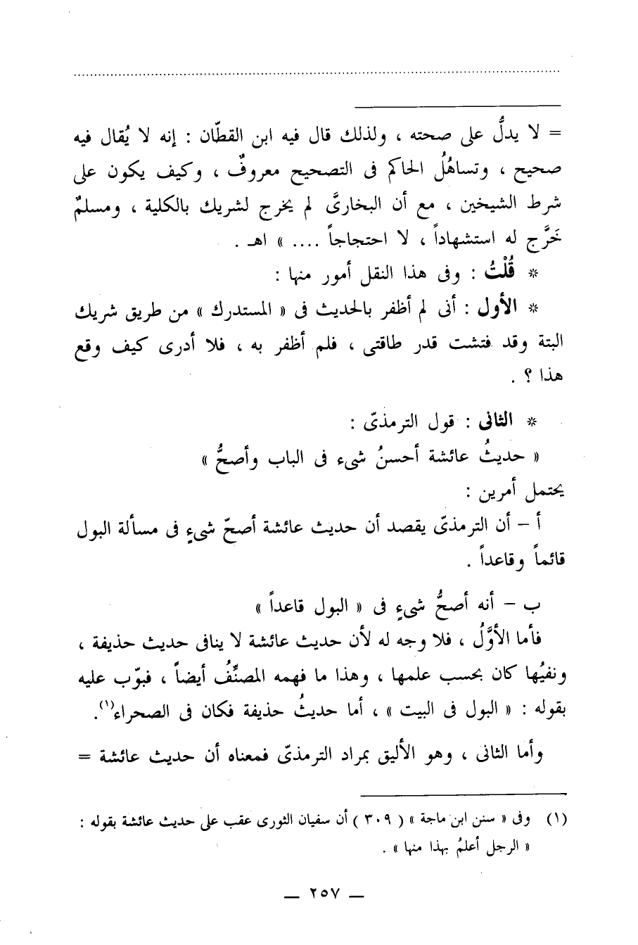 أ- أن الترمذيّ يقصد أن حديث عائشة أصحّ شيءٍ في مسألة البول قائمًا وقاعدًا.