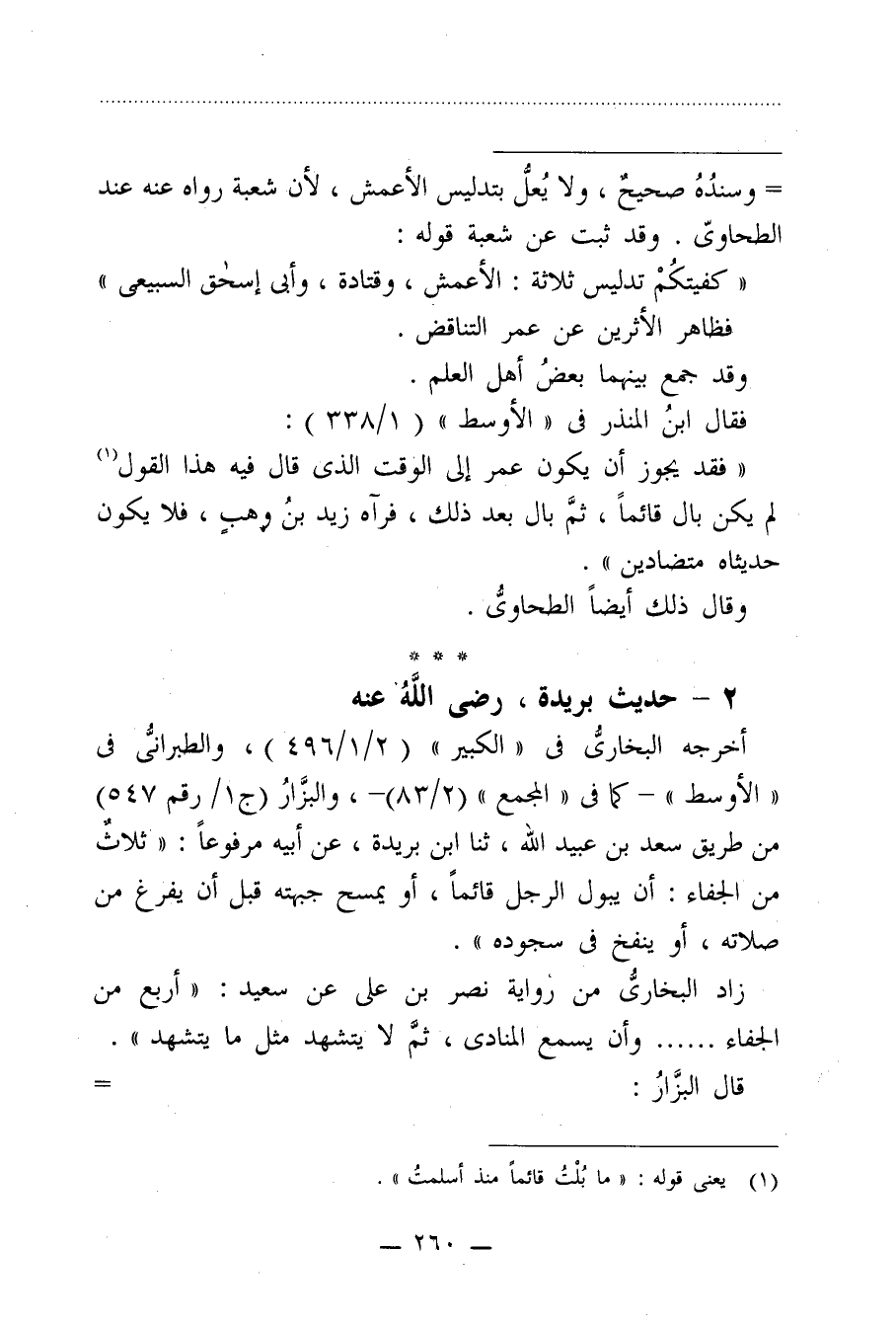 "فقد يجوز أن يكون عمر إلى الوقت الذي قال فيه هذا القول (¬1) لم يكن بال قائمًا، ثمَّ بال بعد ذلك، فرآه زيد بنُ وهبٍ، فلا يكون حديثاه متضادين".