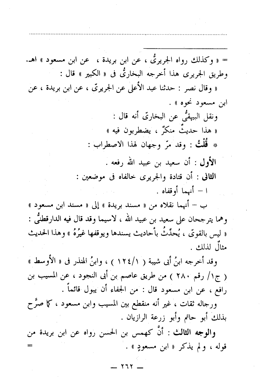 ب- أنهما نقلاه من "مسند بريدة" إلى "مسند ابن مسعود" وهما يترجحان على سعيد بن عبيد الله، لا سيما وقد قال فيه الدارقطنيُّ: "ليس بالقويّ، يُحدِّثُ بأحاديث يسندها ويوقفها غيرُهُ" وهذا الحديث مثالٌ لذلك.