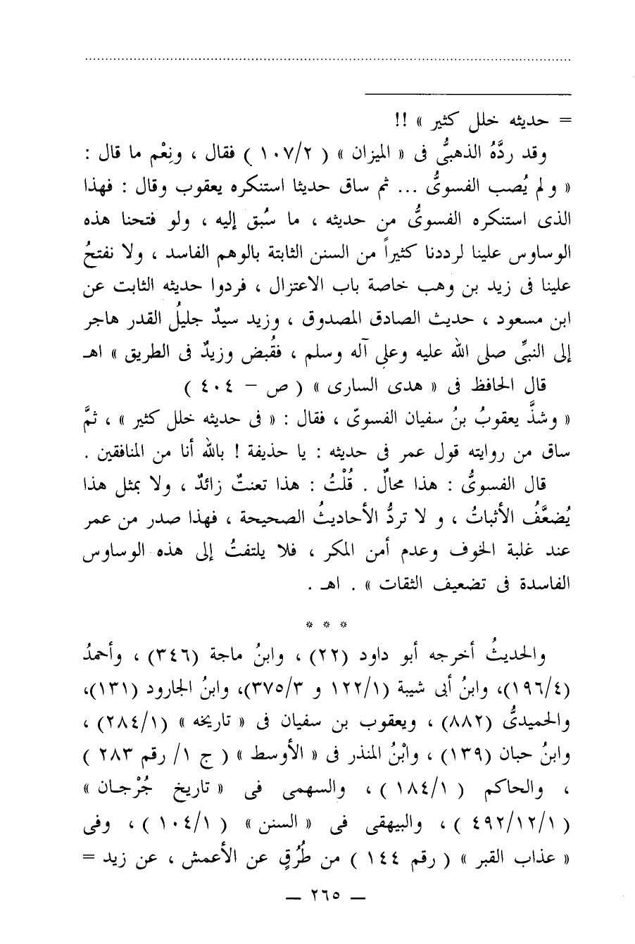 وقد ردَّهُ الذهبيُّ في "الميزان" (2/ 107) فقال، ونِعْم ما قال: "ولم يُصب الفسويُّ ... ثم ساق حديثا استنكره يعقوب وقال: فهذا الذي استنكره الفسويُّ من حديثه، ما سُبق إليه، ولو فتحنا هذه الوساوس علينا لرددنا كثيرًا من السنن الثابتة بالوهم الفاسد، ولا نفتحُ علينا في زيد بن وهب خاصة باب الاعتزال، فردوا حديثه الثابت عن ابن مسعود، حديث الصادق المصدوق، وزيد سيدٌ جليلُ القدر هاجر إلى النبيِّ صلى الله عليه وعلي آله وسلم، فقُبض وزيدٌ في الطريق" اهـ قال الحافظ في "هدى السارى" (ص - 404)