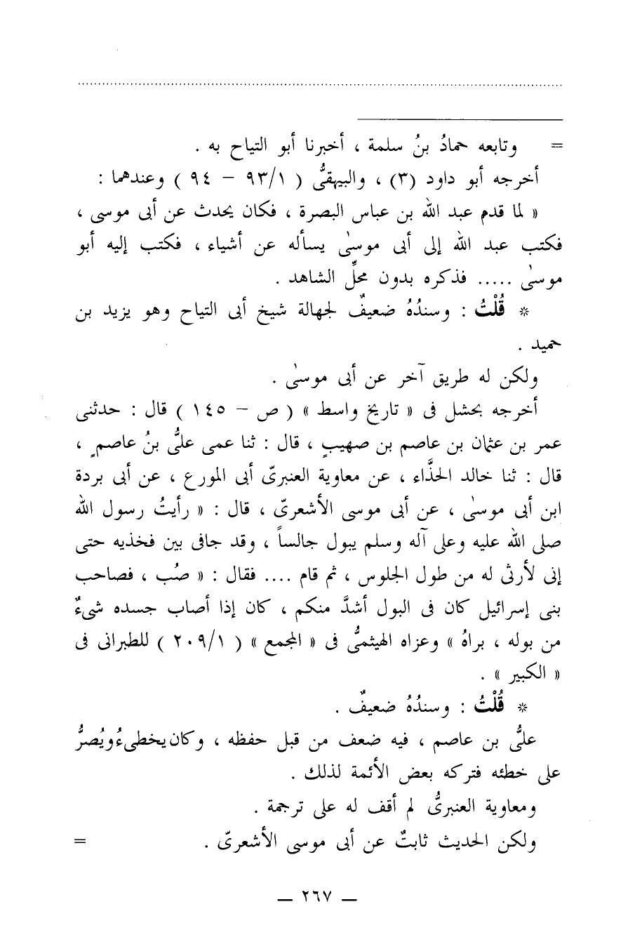 أخرجه بحشل في "تاريخ واسط" (ص - 145) قال: حدثني عمر بن عثمان بن عاصم بن صهيبٍ، قال: ثنا عمى عليُّ بنُ عاصمٍ، قال: ثنا خالد الحذَّاء، عن معاوية العنبريّ أبي المورع، عن أبي بردة ابن أبي موسى، عن أبي موسى الأشعريّ، قال: "رأيتُ رسول الله صلى الله عليه وعلى آله وسلم يبول جالسًا، وقد جافى بين فخذيه حتى إنى لأرثى له من طول الجلوس، ثم قام .... فقال: "صُب، فصاحب بني إسرائيل كان في البول أشدَّ منكم، كان إذا أصاب جسده شىءٌ من بوله، براهُ" وعزاه الهيثميُّ في "المجمع" (1/ 209) للطبراني في "الكبير".