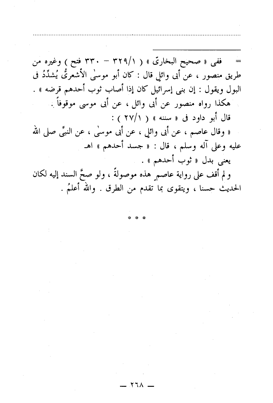 = ففي "صحيح البخاريّ" (1/ 329 - 330 فتح) وغيره من طريق منصور، عن أبي وائلٍ قال: كان أبو موسى الأشعريُّ يُشدِّدُ في البول ويقول: إن بني إسرائيل كان إذا أصاب ثوب أحدهم قرضه".