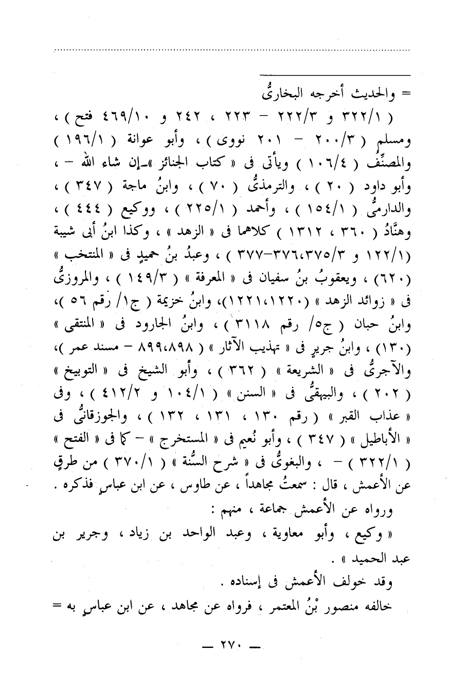 (1/ 322 و 3/ 222 - 223، 242 و 10/ 469 فتح)، ومسلم (3/ 200 - 201 نووى)، وأبو عوانة (1/ 196) والمصنِّفُ (4/ 106) ويأتى في "كتاب الجنائز" -إن شاء الله-، وأبو داود (20)، والترمذيُّ (70)، وابنُ ماجة (347)، والدارميُّ (1/ 154)، وأحمد (1/ 225)، ووكيع (444)، وهنَّادُ (360، 1312) كلاهما في "الزهد"، وكذا ابنُ أبي شيبة (1/ 122 و 3/ 375،376 - 377)، وعبدُ بنُ حميدٍ في "المنتخب" (620)، ويعقوبُ بنُ سفيان في "المعرفة" (3/ 149)، والمروزيُّ في "زوائد الزهد" (1220، 1221)، وابنُ خزيمة (ج1/ رقم 56)، وابنُ حبان (ج5 / رقم 3118)، وابنُ الجارود في "المنتقى" (130)، وابنُ جريرٍ في "تهذيب الآثار" (899،898 - مسند عمر)، والآجريُّ في "الشريعة" (362)، وأبو الشيخ في "التوبيخ" (202)، والبيهقيُّ في "السنن" (1/ 104 و 2/ 412)، وفي "عذاب القبر" (رقم 130، 131، 132)، والجوزقانيُّ في "الأباطيل" (347)، وأبو نُعيم في "المستخرج" -كما في "الفتح" (1/ 322) -، والبغويُّ في "شرح السُّنة" (1/ 370) من طرقٍ عن الأعمش، قال: سمعتُ مجاهدًا، عن طاوس، عن ابن عباسٍ فذكره.