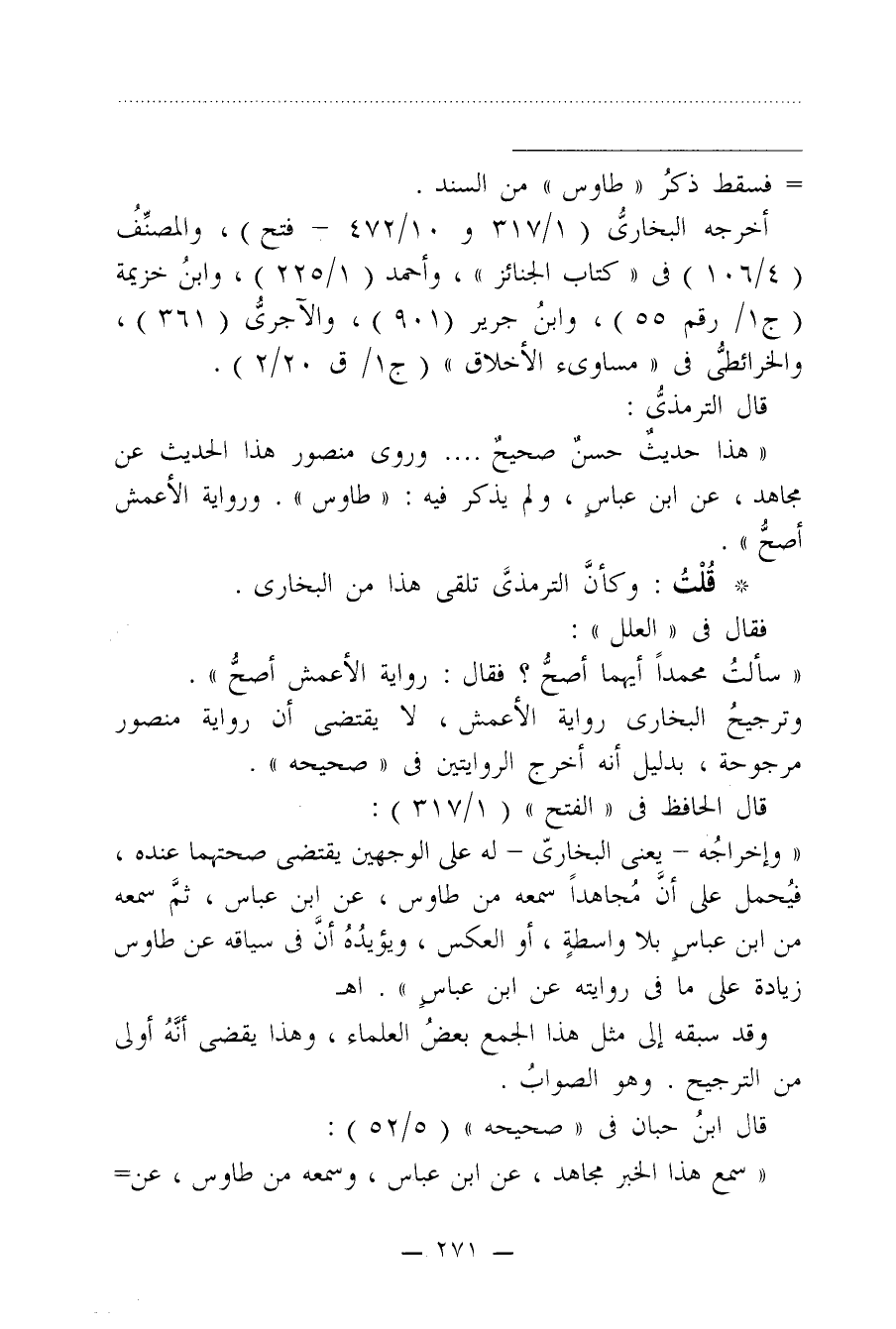 "هذا حديثٌ حسنٌ صحيحٌ .... وروى منصور هذا الحديث عن مجاهد، عن ابن عباسٍ، ولم يذكر فيه: "طاوس". ورواية الأعمش أصحُّ".