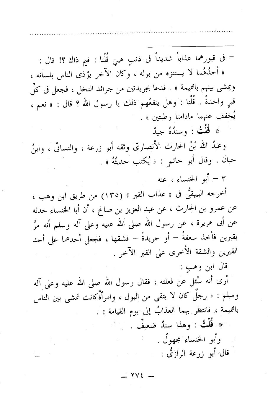 = في قبورهما عذابًا شديدًا في ذنبٍ هينٍ قُلْنا: فيم ذاك؟! قال: "أحدُهُما لا يستنزه من بوله، وكان الآخر يؤذى الناس بلسانه، ويمشى بينهم بالنميمة". فدعا بجريدتين من جرائد النخل، فجعل في كلِّ قبرٍ واحدةً. قُلْنا: وهل ينفعُهم ذلك يا رسول الله؟ قال: "نعم، يُخفف عنهما مادامتا رطبتين".