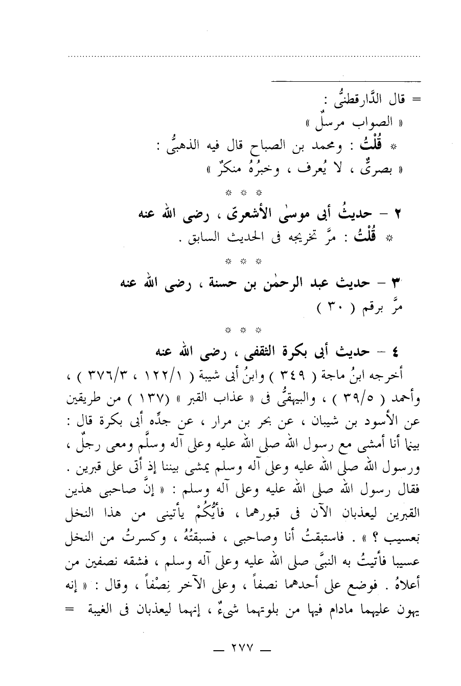 أخرجه ابنُ ماجة (349) وابنُ أبي شيبة (1/ 122، 3/ 376)، وأحمد (5/ 39)، والبيهقيُّ في "عذاب القبر" (137) من طريقين عن الأسود بن شيبان، عن بكر بن مرار، عن جدِّه أبي بكرة قال: بينما أنا أمشى مع رسول الله صلى الله عليه وعلى آله وسلَّم ومعى رجل، ورسول الله صلى الله عليه وعلى آله وسلم يمشي بيننا إذ أتى على قبرين. فقال رسول الله صلى الله عليه وعلى آله وسلم: "إنَّ صاحبى هذين القبرين ليعذبان الآن في قبورهما، فأيُّكُمْ يأتينى من هذا النخل بعسيب؟ ". فاستبقتُ أنا وصاحبى، فسبقتُهُ، وكسرتُ من النخل عسيبا فأتيتُ به النبيَّ صلى الله عليه وعلى آله وسلم، فشقه نصفين من أعلاهُ. فوضع على أحدهما نصفًا، وعلى الآخر نِصْفًا، وقال: "إنه يهون عليهما ما دام فيما من بلوتهما لشىءٌ، إنهما ليعذبان في الغيبة =