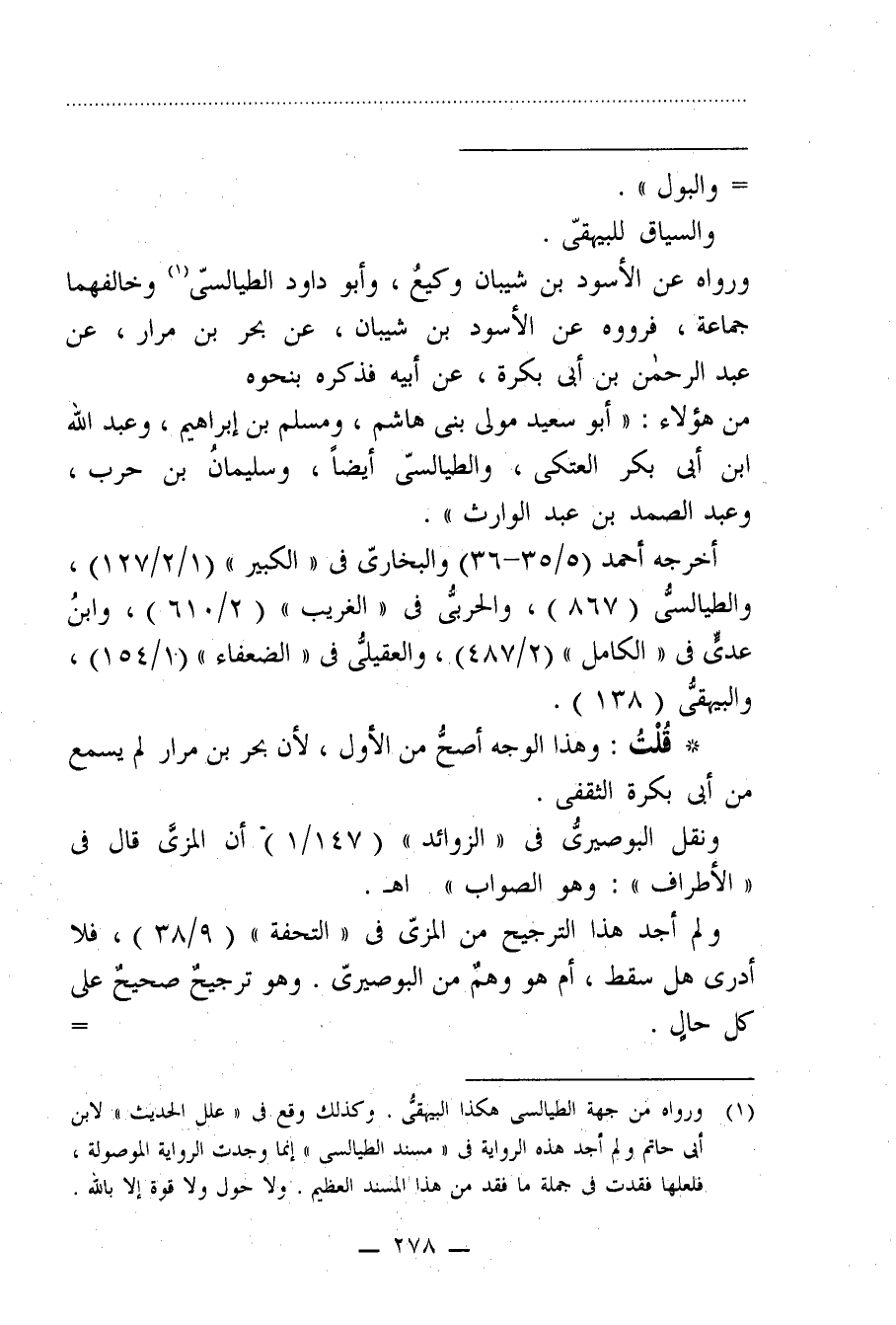 (¬1) ورواه من جهة الطيالسي هكذا البيهقيٌّ. وكذلك وقع في "علل الحديث" لابن أبي حاتم ولم أجد هذه الرواية في "مسند الطيالسي" إنما وجدت الرواية الموصولة، فلعلها فقدت في جملة ما فقد من هذا المسند العظيم. ولا حول ولا قوة إلا بالله.