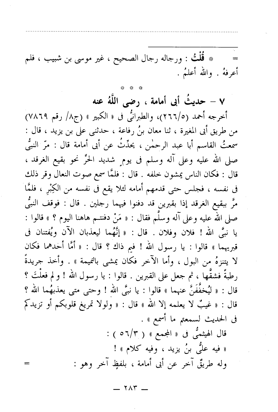 أخرجه أحمد (5/ 266)، والطبرانيُّ في "الكبير" (ج 8 / رقم 7869) من طريق أبي المغيرة، ثنا معان بنُ رفاعة، حدثني علي بن يزيد، قال: سمعتُ القاسم أبا عبد الرحمن، يحدِّثُ عن أبي أمامة قال: مرّ النبيُّ صلى الله عليه وعلى آله وسلم في يومٍ شديد الحرِّ نحو بقيع الغرقد، قال: فكان الناس يمشون خلفه. قال: فلمَّا سمع صوت النعال وقر ذلك في نفسه، فجلس حتى قدمهم أمامه لئلا يقع في نفسه من الكِبْرِ، فلمَّا مرَّ ببقيع الغرقد إذا بقبرين قد دفنوا فيهما رجلين. قال: فوقف النبيُّ صلى الله عليه وعلى آله وسلَّم فقال: "مَنْ دفنتم هاهنا اليوم؟ " قالوا: يا نبيَّ الله! فلان وفلان. قال: "إنَّهُما ليعذبان الآن ويُفتنان في قبريهما" قالوا: يا رسول الله! فيم ذاك؟ قال: "أمَّا أحدهما فكان لا يتنزهُ من البول، وأما الآخر فكان يمشي بالنميمة". وأخذ جريدةً رطبةً فشقَّها، ثم جعل على القبرين. قالوا: يا رسول الله! ولم فعلْتَ؟ قال: "ليُخفَّفَنَّ عنهما" قالوا: يا نبيَّ الله! وحتى متى يعذبهُما الله؟ قال: "غيبٌ لا يعلمه إلا الله" قال: "ولولا تمريغ قلوبكم أو تزيدكم في الحديث لسمعتم ما أسمع".