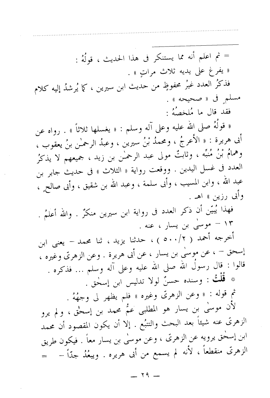 "قولُهُ صلى الله عليه وعلى آله وسلم: "يغسلها ثلاثًا". رواه عن أبي هريرة: "الأعرجُ، ومحمدُ بْنُ سيرين، وعبدُ الرحمن بنُ يعقوب، وهمامُ بْنُ مُنبِّه، وثابتٌ مولى عبد الرحمن بن زيد، جميعهم لا يذكرُ العدد في غسل اليدين. ووقعت رواية "الثلاث" في حديث جابر بن عبد الله، وابن المسيب، وأبي سلمة، وعبد الله بن شقيق، وأبي صالحٍ، وأبي رزين" اهـ.