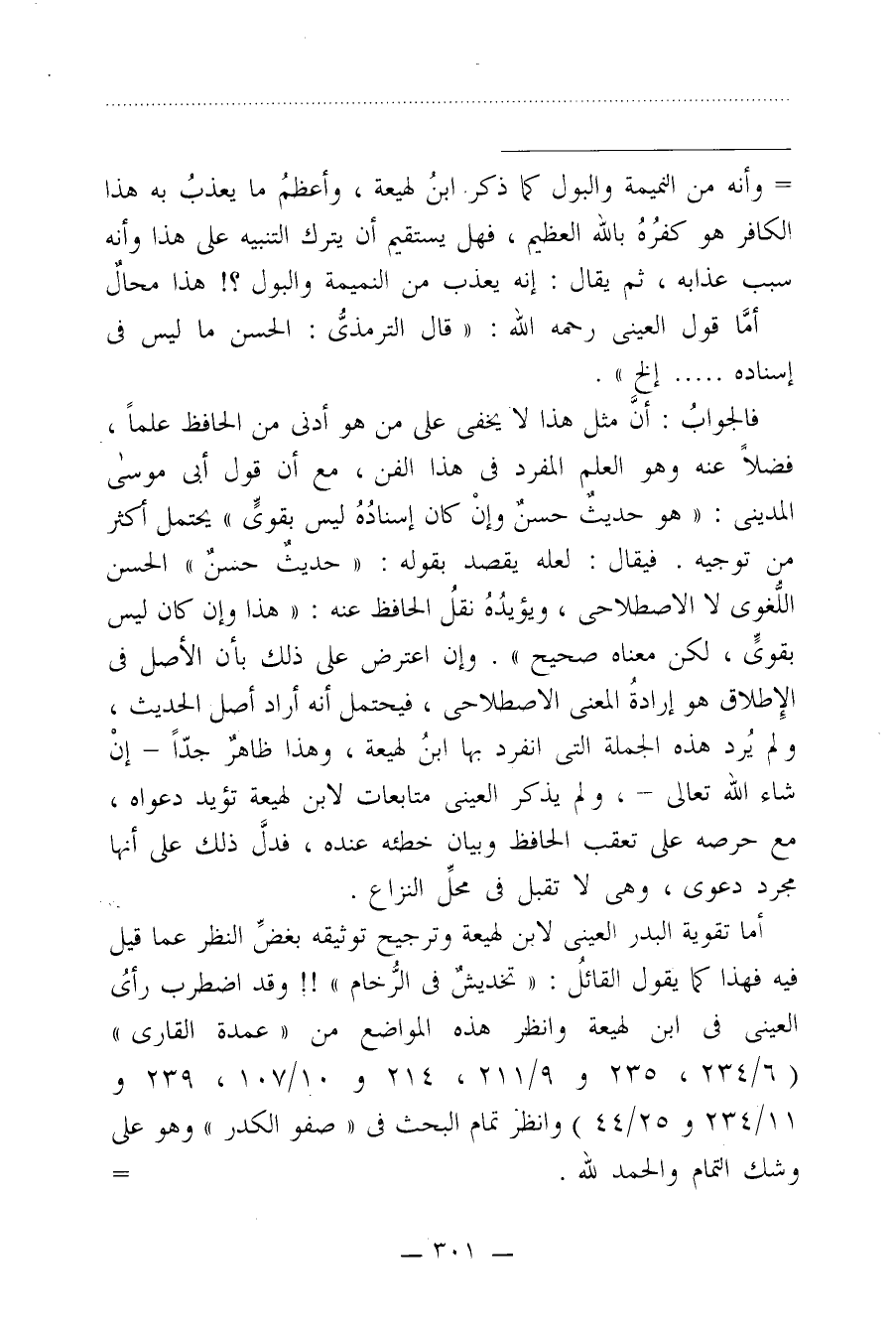 أما تقوية البدر العينى لابن لهيعة وترجيح توثيقه بغضِّ النظر عما قيل فيه فهذا كما يقول القائلُ: "تخديشٌ في الرُّخام"!! وقد اضطرب رأىُ العينى في ابن لهيعة وانظر هذه المواضع من "عمدة القارى" (6/ 234، 235 و 9/ 211، 214 و 10/ 107، 239 و 11/ 234 و 25/ 44) وانظر تمام البحث في "صفو الكدر" وهو على وشك التمام والحمد لله. =