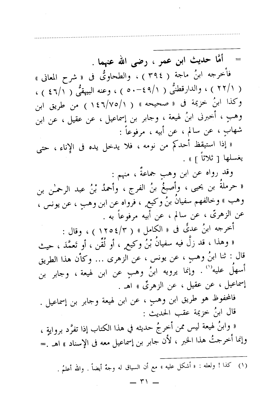 فأخرجه ابنُ ماجة (394)، والطحاويُّ في "شرح المعاني" (1/ 22)، والدارقطنيُّ (1/ 49 - 50)، وعنه البيهقيُّ (1/ 46)، وكذا ابنُ خزيمة في "صحيحه" لمن (1/ 75/ 146) من طريق ابن وهبٍ، أخبرني ابنُ لهيعة، وجابر بن إسماعيل، عن عقيل، عن ابن شهابٍ، عن سالم، عن أبيه، مرفوعًا: