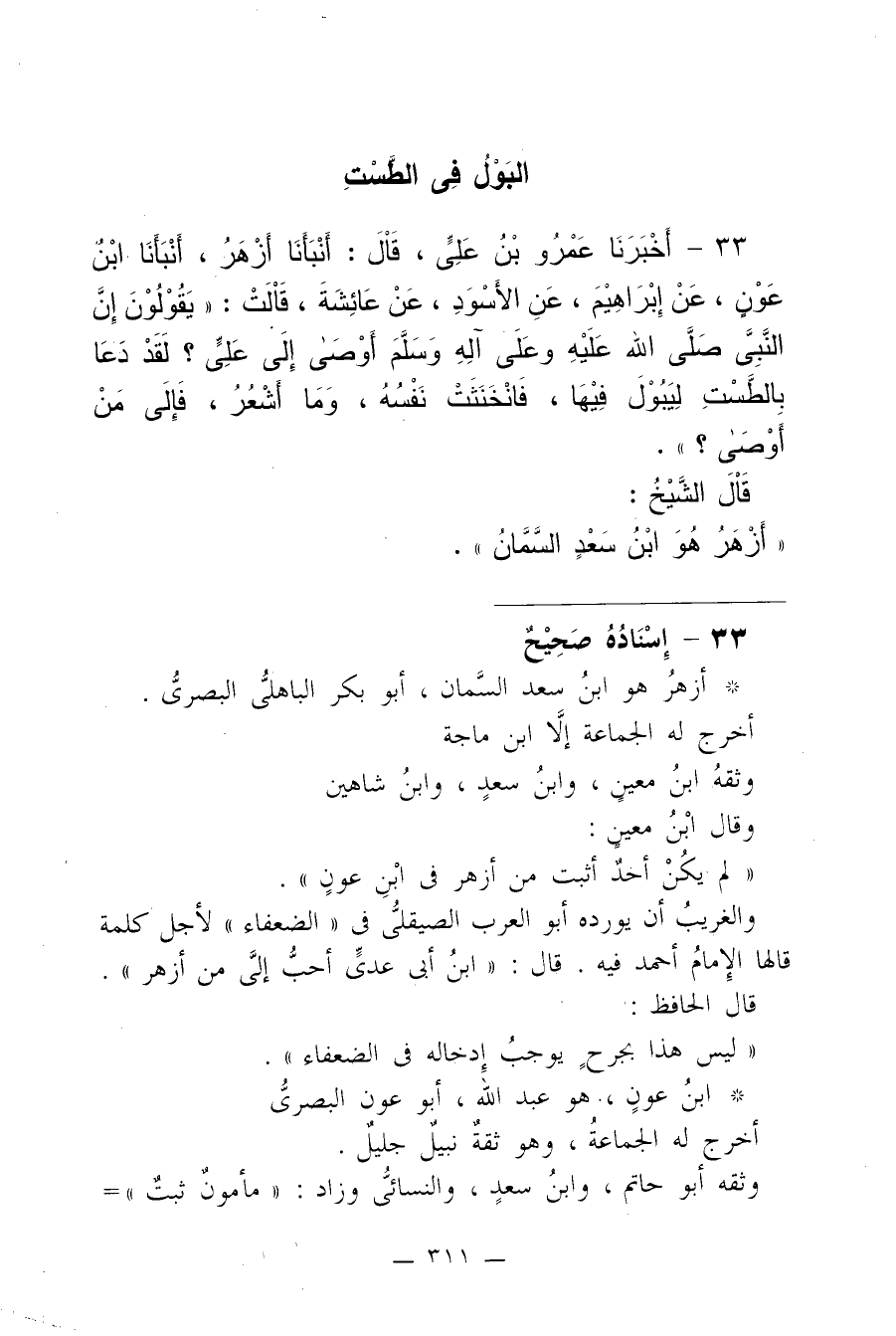 33 - أَخْبَرَنَا عَمْرُو بْنُ عَلِىٍّ قَالَ أَنْبَأَنَا أَزْهَرُ أَنْبَأَنَا ابْنُ عَوْنٍ عَنْ إِبْرَاهِيمَ عَنِ الأَسْوَدِ عَنْ عَائِشَةَ قَالَتْ يَقُولُونَ إِنَّ النَّبِىَّ -صلى الله عليه وسلم- أَوْصَى إِلَى عَلِىٍّ لَقَدْ دَعَا بِالطَّسْتِ لِيَبُولَ فِيهَا فَانْخَنَثَتْ نَفْسُهُ وَمَا أَشْعُرُ فَإِلَى مَنْ أَوْصَى قَالَ الشَّيْخُ أَزْهَرُ هُوَ ابْنُ سَعْدٍ السَّمَّانُ.
