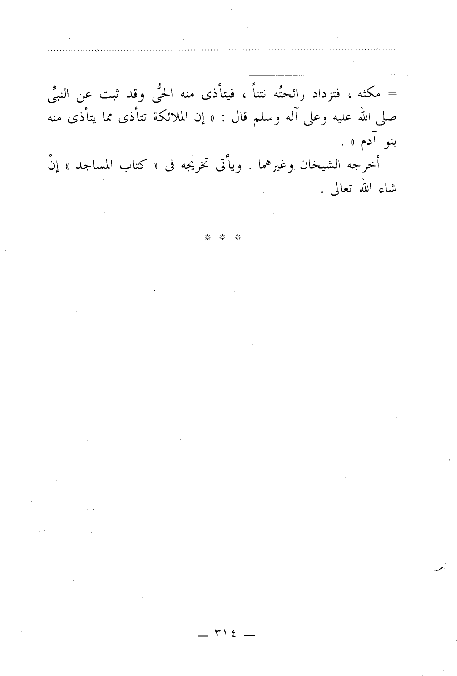 = مكثه، فتزداد رائحتُه نتنًا، فيتأذى منه الحيُّ وقد ثبت عن النبيّ صلى الله عليه وعلى آله وسلم قال: "إن الملائكة تتأذى مما يتأذى منه بنو آدم".