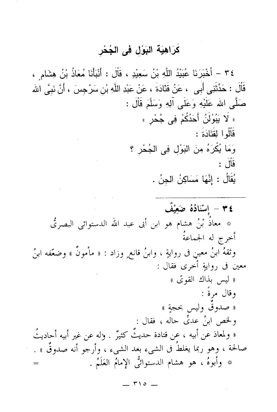 34 - أَخْبَرَنَا عُبَيْدُ اللَّهِ بْنُ سَعِيدٍ قَالَ أَنْبَأَنَا مُعَاذُ بْنُ هِشَامٍ قَالَ حَدَّثَنِى أَبِى عَنْ قَتَادَةَ عَنْ عَبْدِ اللَّهِ بْنِ سَرْجِسَ أَنَّ نَبِىَّ اللَّهِ -صلى الله عليه وسلم- قَالَ «لاَ يَبُولَنَّ أَحَدُكُمْ فِى جُحْرٍ». قَالُوا لِقَتَادَةَ وَمَا يُكْرَهُ مِنَ الْبَوْلِ فِى الْجُحْرِ قَالَ يُقَالُ إِنَّهَا مَسَاكِنُ الْجِنِّ.