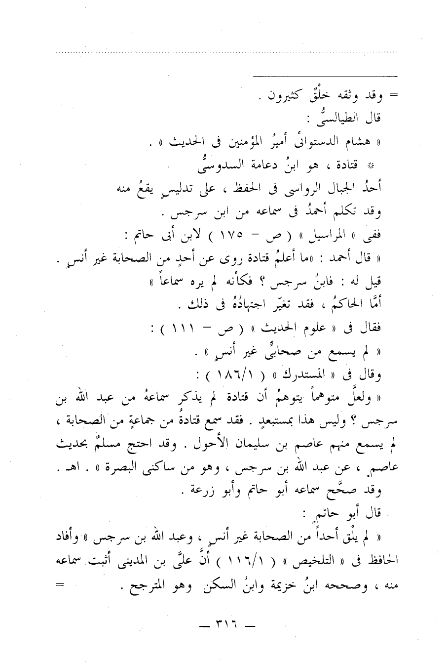 "ولعلَّ متوهمًا يتوهمُ أن قتادة لم يذكر سماعهُ من عبد الله بن سرجس؟ وليس هذا بمستبعدٍ. فقد سمع قتادةُ من جماعةٍ من الصحابة، لم يسمع منهم عاصم بن سليمان الأحول. وقد احتج مسلمٌ بحديث عاصمٍ، عن عبد الله بن سرجس، وهو من ساكنى البصرة". اهـ.