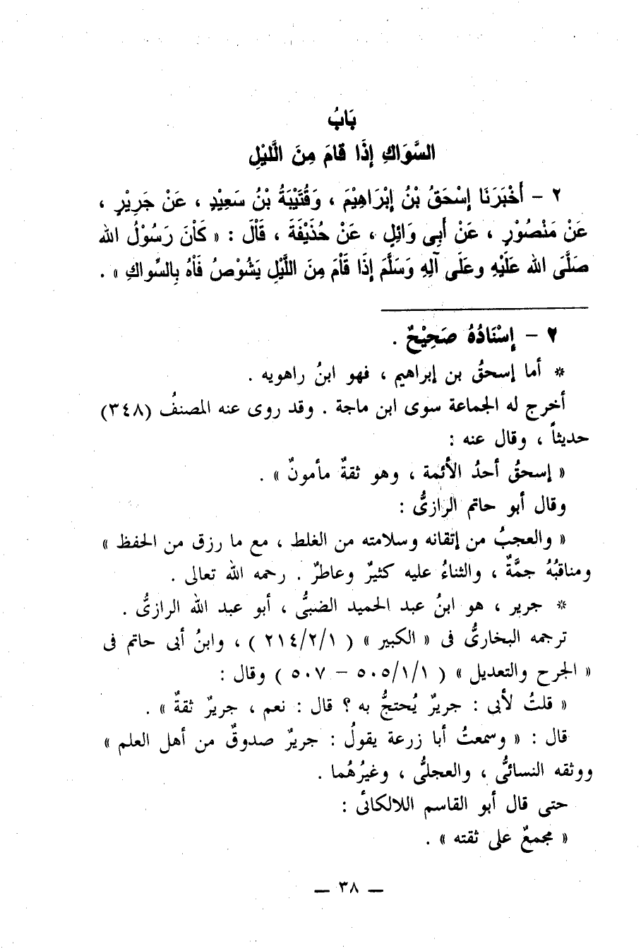 2 - أَخْبَرَنَا إِسْحَاقُ بْنُ إِبْرَاهِيمَ وَقُتَيْبَةُ بْنُ سَعِيدٍ عَنْ جَرِيرٍ عَنْ مَنْصُورٍ عَنْ أَبِى وَائِلٍ عَنْ حُذَيْفَةَ قَالَ كَانَ رَسُولُ اللَّهِ -صلى الله عليه وسلم- إِذَا قَامَ مِنَ اللَّيْلِ يَشُوصُ فَاهُ بِالسِّوَاكِ.
