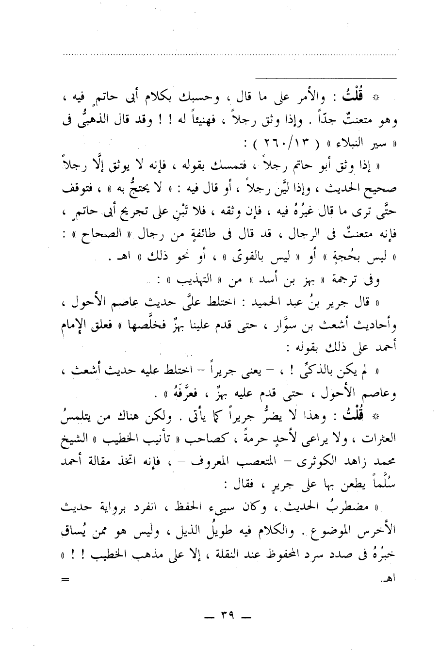 * قُلْتُ: وهذا لا يضرُّ جريرًا كما يأتي. ولكن هناك من يتلمسُ العثرات، ولا يراعى لأحدٍ حرمةً، كصاحب "تأنيب الخطيب" الشيخ محمد زاهد الكوثري -المتعصب المعروف-، فإنه اتخذ مقالة أحمد سُلَّمًا يطعن بها على جريرٍ، فقال:
