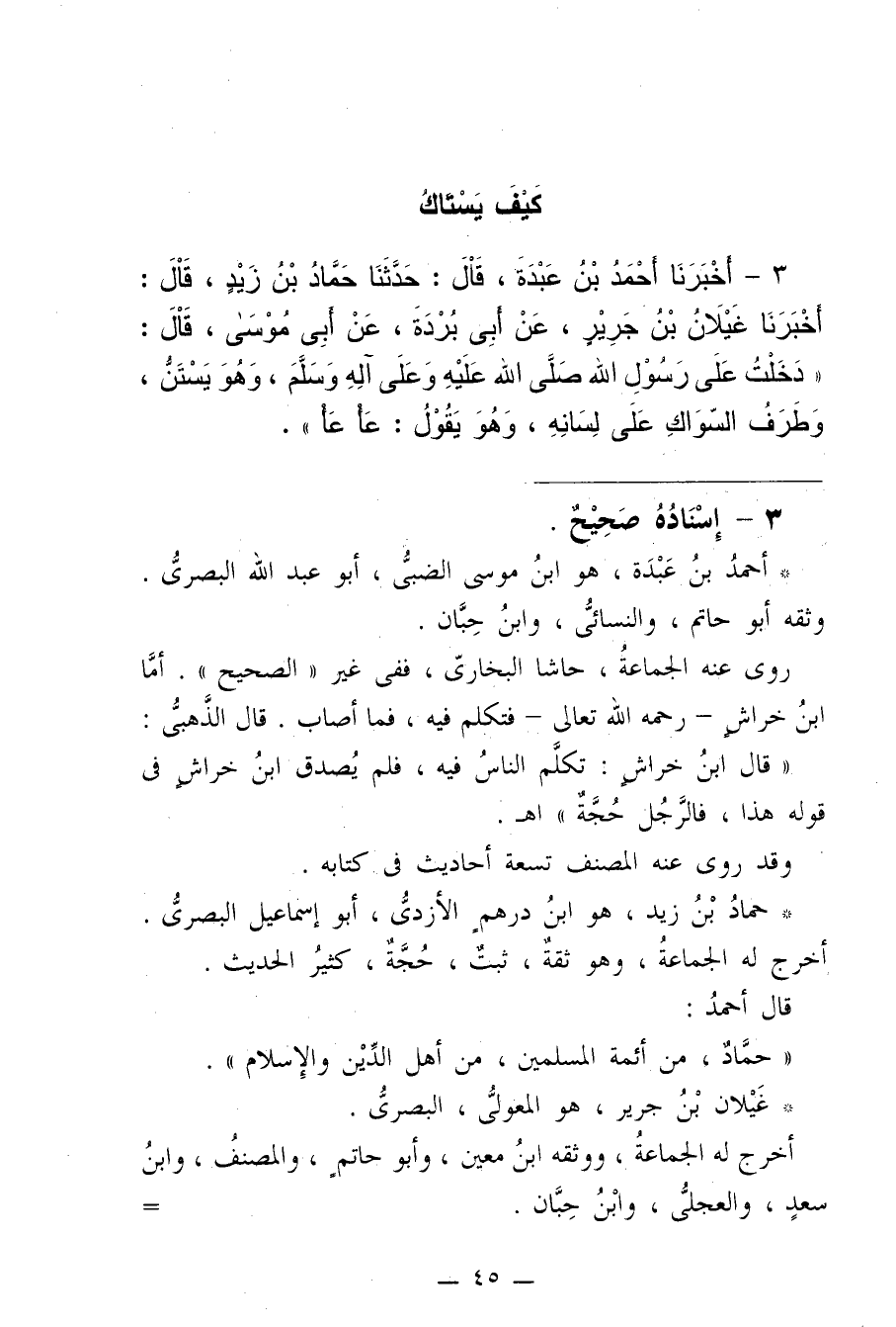 3 - أَخْبَرَنَا أَحْمَدُ بْنُ عَبْدَةَ قَالَ حَدَّثَنَا حَمَّادُ بْنُ زَيْدٍ قَالَ أَخْبَرَنَا غَيْلاَنُ بْنُ جَرِيرٍ عَنْ أَبِى بُرْدَةَ عَنْ أَبِى مُوسَى قَالَ دَخَلْتُ عَلَى رَسُولِ اللَّهِ -صلى الله عليه وسلم- وَهُوَ يَسْتَنُّ وَطَرَفُ السِّوَاكِ عَلَى لِسَانِهِ وَهُوَ يَقُولُ «عَأْعَأْ».