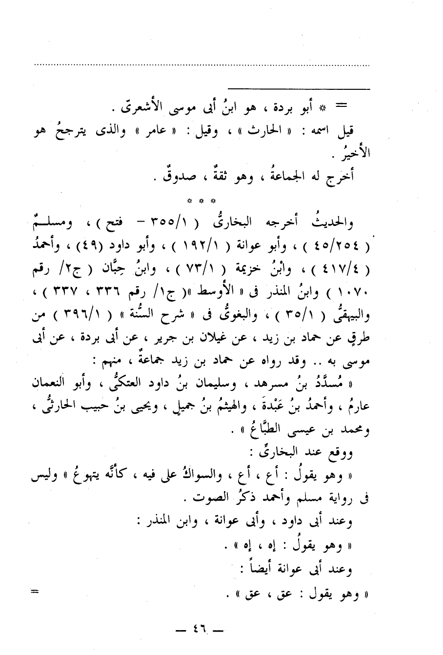 والحديثُ أخرجه البخاريُّ (1/ 355 - فتح)، ومسلمٌ (254/ 45)، وأبو عوانة (1/ 192)، وأبو داود (49)، وأحمدُ (4/ 417)، وابْنُ خزيمة (1/ 73)، وابنُ حِبِّان (ج2 / رقم 1070) وابنُ المنذر في "الأوسط" (ج1/ رقم 336، 337)، والبيهقي (1/ 35)، والبغويُّ في "شرح السُّنة" (1/ 396) من طرقٍ عن حماد بن زيد، عن غيلان بن جرير، عن أبي بردة، عن أبي موسى به .. وقد رواه عن حماد بن زيد جماعةٌ، منهم: