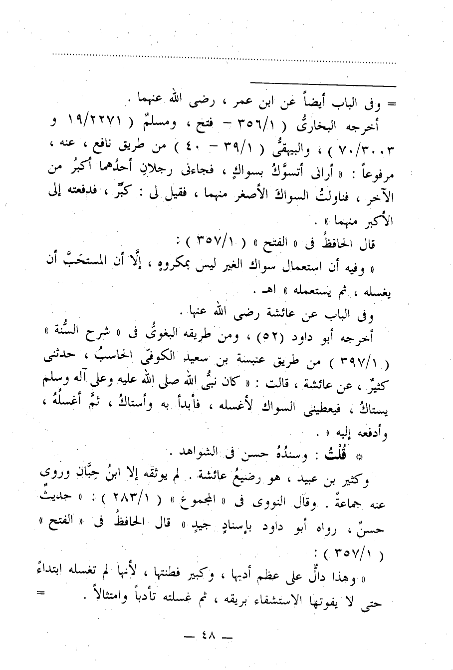 أخرجه أبو داود (52)، ومن طريقه البغويُّ في "شرح السُّنة" (1/ 397) من طريق عنبسة بن سعيد الكوفي الحاسبُ، حدثني كثيرٌ، عن عائشة، قالت: "كان نبيُّ الله صلى الله عليه وعلى آله وسلم يستاكُ، فيعطيني السواك لأغسله، فأبدأ به وأستاكُ، ثمَّ أغسلُهُ، وأدفعه إليه".