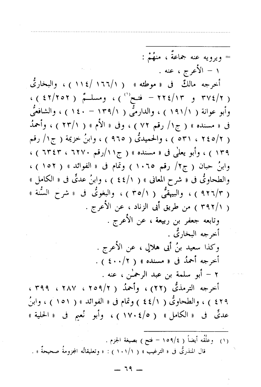 أخرجه مالكٌ في "موطئه" (1/ 166 /114)، والبخاريُّ (2/ 374 و 3/ 224 فتح (¬1))، ومسلمٌ (252/ 42)، وأبو عوانة (1/ 191)، والدارميّ (1/ 139 - 140)، والشافعيُّ في "مسنده" (ج 1 / رقم 72)، وفي "الأم" (1/ 23)، وأحمدُ (2/ 245، 531)، والحميديُّ (965)، وابنُ خزيمة (ج1/ رقم 139)، وأبو يعلى في "مسنده" (ج 11 / رقم 6270، 6343)، وابنُ حبان (ج2 / رقم 1065) وتمام في "الفوائد" (152)، والطحاويُّ في "شرح المعاني" (1/ 44)، وابنُ عديٍّ في "الكامل" (3/ 926)، والبيهقيُّ (1/ 35)، والبغويُّ في "شرح السُّنة" (1/ 392) من طريق أبي الزناد، عن الأعرج.