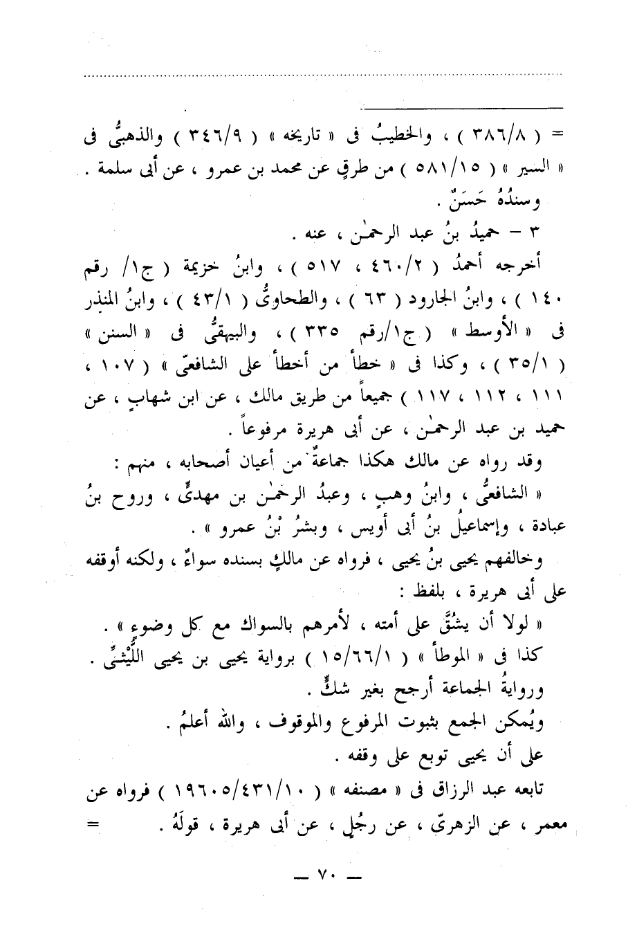 أخرجه أحمدُ (2/ 460، 517)، وابنُ خزيمة (ج/1 رقم 140)، وابنُ الجارود (63)، والطحاويُّ (1/ 43)، وابنُ المنذر في "الأوسط" (ج 1/ رقم 335)، والبيهقيُّ في "السنن" (1/ 35)، وكذا في "خطأ من أخطأ على الشافعيّ" (107، 111، 112، 117) جميعًا من طريق مالك، عن ابن شهاب، عن حميد بن عبد الرحمن، عن أبي هريرة مرفوعًا.