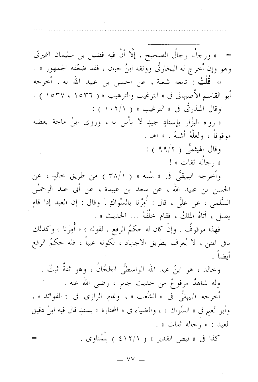 = "ورجاله رجال الصحيح، إلا أنَّ فيه فضيل بن سليمان النميري وهو وإن أخرج له البخاريُّ ووثقه ابن حبان، فقد ضعّفه الجمهور".