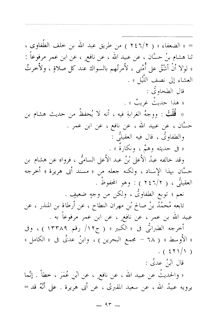 = "الضعفاء" (2/ 246) من طريق عبد الله بن خلف الطُفاوى، ثنا هشام بنُ حسَّان، عن عبيد الله، عن نافعٍ، عن ابن عمر مرفوعًا: "لَوْلاَ أَنْ أَشُقَّ عَلَى أُمَّتِى، لأَمَرْتُهُمْ بِالسِّوَاكِ عِنْدَ كُلِّ صَلاَةٍ، ولأخرتُ العشاء إلى نصف اللَّيْل".