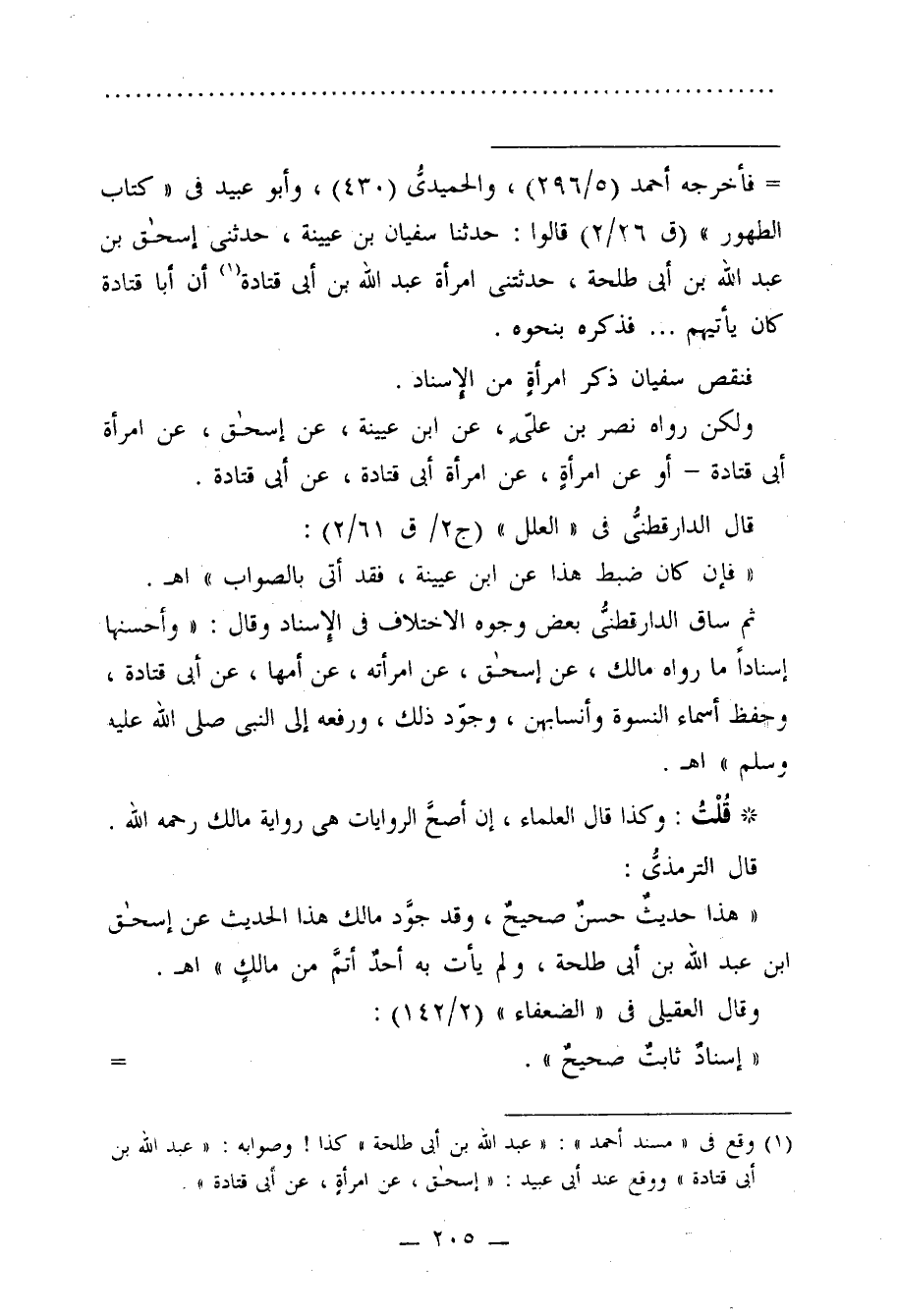 ثم ساق الدارقطنيّ بعض وجوه الاختلاف في الإِسناد وقال: "وأحسنها إسنادًا ما رواه مالك، عن إسحق، عن امرأته، عن أمها، عن أبي قتادة، وحفظ أسماء النسوة وأنسابهن، وجوَّد ذلك، ورفعه إلى النبي صلى الله عليه وسلم" اهـ.