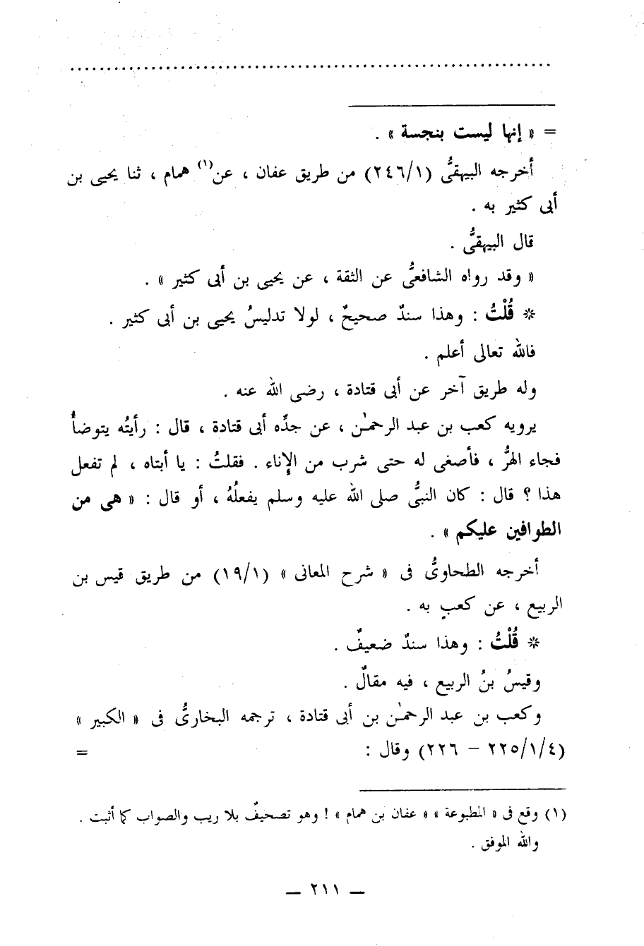 يرويه كعب بن عبد الرحمن، عن جده أبي قتادة، قال: رأيتُه يتوضأ فجاء الهرُّ، فأصغى له حتى شرب من الإناء. فقلتُ: يا أبتاه، لم تفعل هذا؟ قال: كان النبي -صلى الله عليه وسلم- يفعلُهُ، أو قال: "هي من الطوافين عليكم".