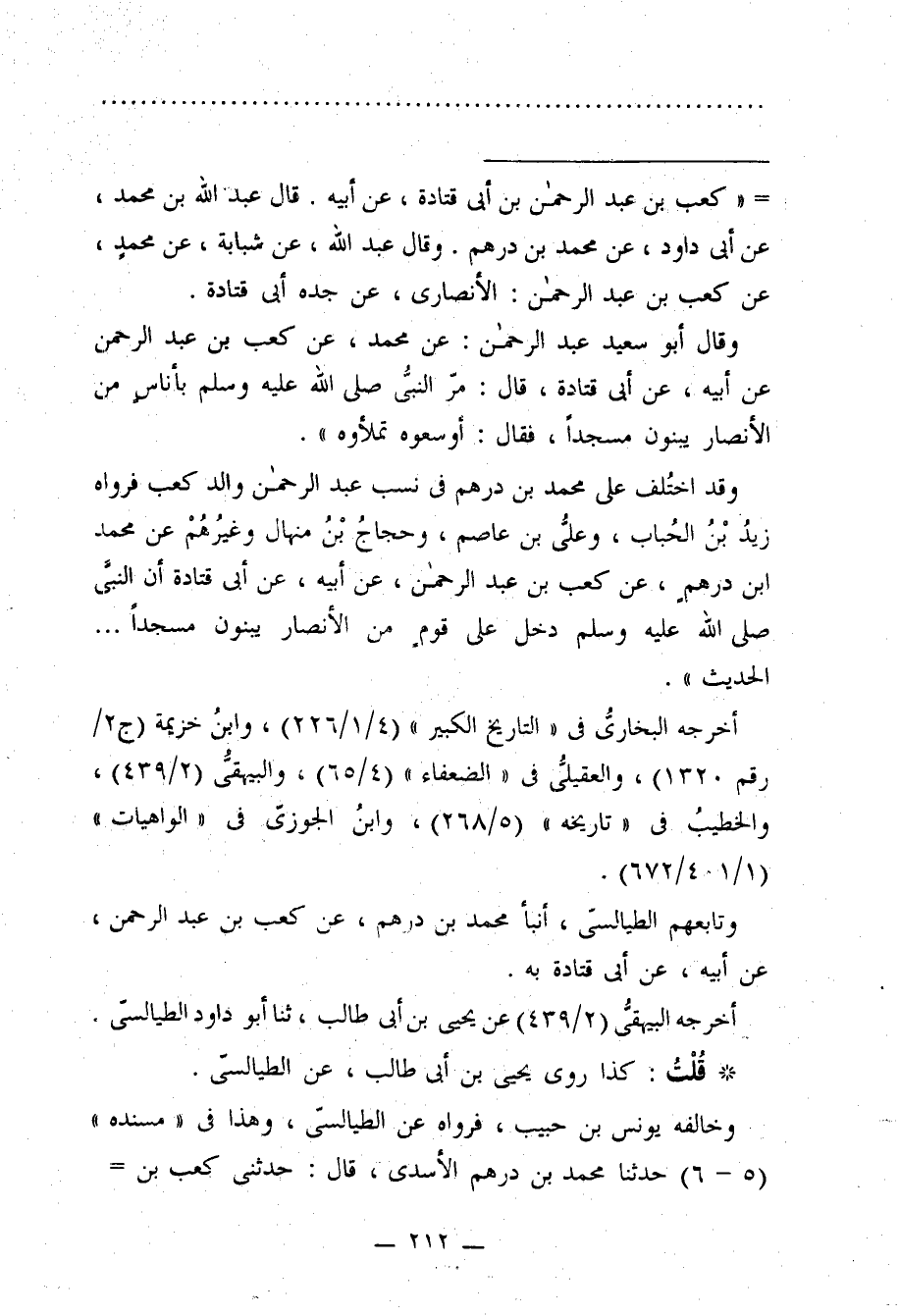 وقد اختُلف على محمد ابن درهم في نسب عبد الرحمن والد كعب فرواه زيدُ بْنُ الحُباب، وعليُّ بن عاصم، وحجاجُ بْنُ منهال وغيرُهُمْ عن محمد ابن درهمٍ، عن كعب بن عبد الرحمن، عن أبيه، عن أبي قتادة أن النبي صلى الله عليه وسلم دخل على قومٍ من الأنصار يبنون مسجدًا ... الحديث".