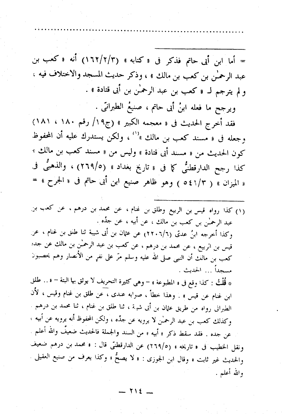 = ما ابن أبي حاتم فذكر في "كتابه" (3/ 2 /162) أنه "كعب بن عبد الرحمن بن كعب بن مالك"، وذكر حديث المسجد والاختلاف فيه، ولم يترجم لـ "كعب بن عبد الرحمن بن أبي قتادة".