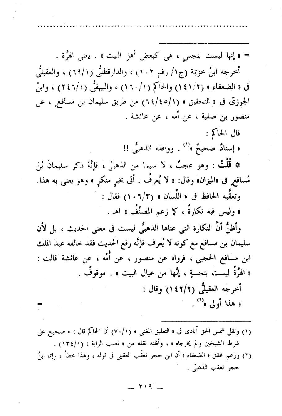 وأظن أنَّ النكارة التي عناها الذهبي ليست في معنى الحديث، بل لأن سليمان بن مسافع مع كونه لا يُعرف فإنه رفع الحديث فقد خالفه عبد الملك بن مسافع الحجبي، فرواه عن منصور، عن أُمِّه، عن عائشة قالت: "الهرَّةُ ليست بنجسةٍ، إنَّها من عيال البيت". موقوفٌ.