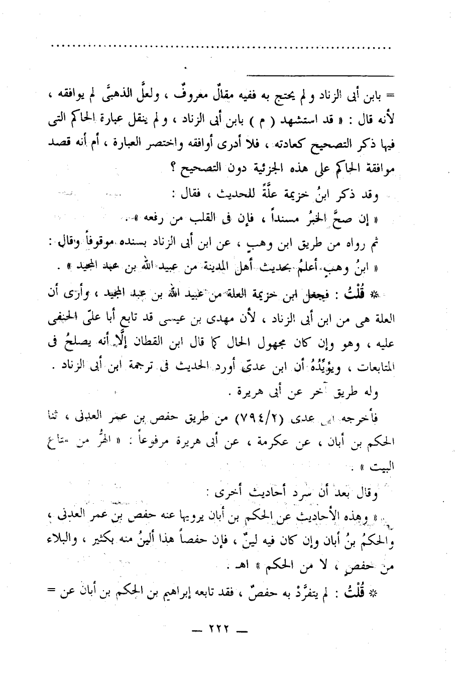 * قُلْتُ: فجعل ابن خزيمة العلة من عبيد الله بن عبد المجيد، وأرى أن العلة هي من ابن أبي الزناد، لأن مهدي بن عيسى قد تابع أبا علي الحنفي عليه، وهو وإن كان مجهول الحال كما قال ابن القطان إلَّا أنه يصلحُ في المتابعات، ويؤيِّدُهُ أن ابن عديّ أورد الحديث في ترجمة ابن أبي الزناد.