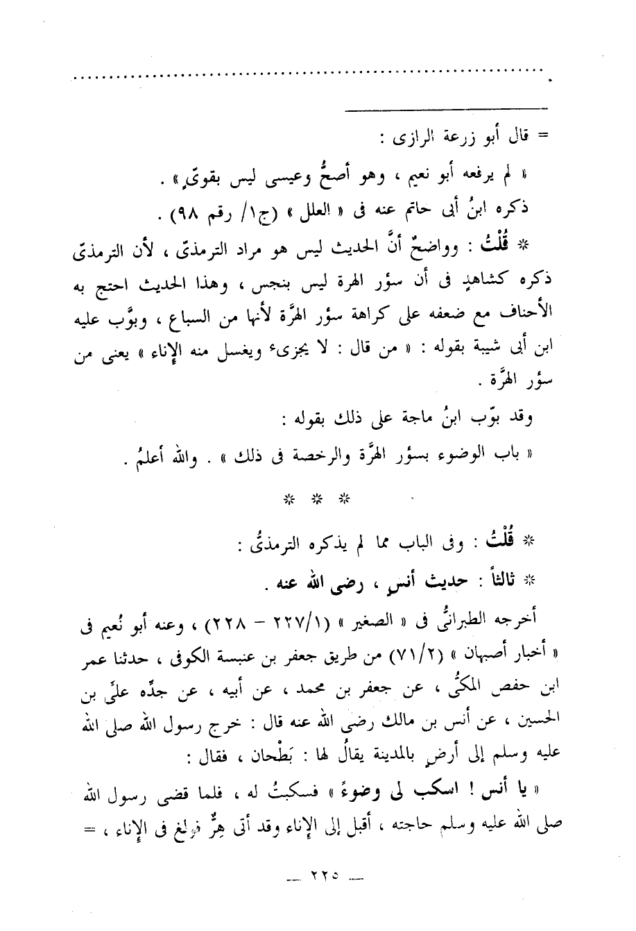 * قُلْتُ: وواضحٌ أنَّ الحديث ليس هو مراد الترمذيّ، لأن الترمذيّ ذكره كشاهدٍ في أن سؤر الهرة ليس بنجس، وهذا الحديث احتج به الأحناف مع ضعفه على كراهة سؤر الهرَّة لأنها من السباع، وبوَّب عليه ابن أبي شيبة بقوله: "من قال: لا يجزئ ويغسل منه الإناء" يعني من سؤر الهرَّة.