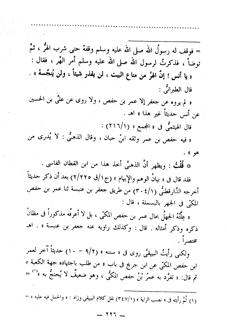"فيه حفص بن عمر وثقه ابنُ حبان، وقال الذهبيُّ: لا يُدرى من هو".