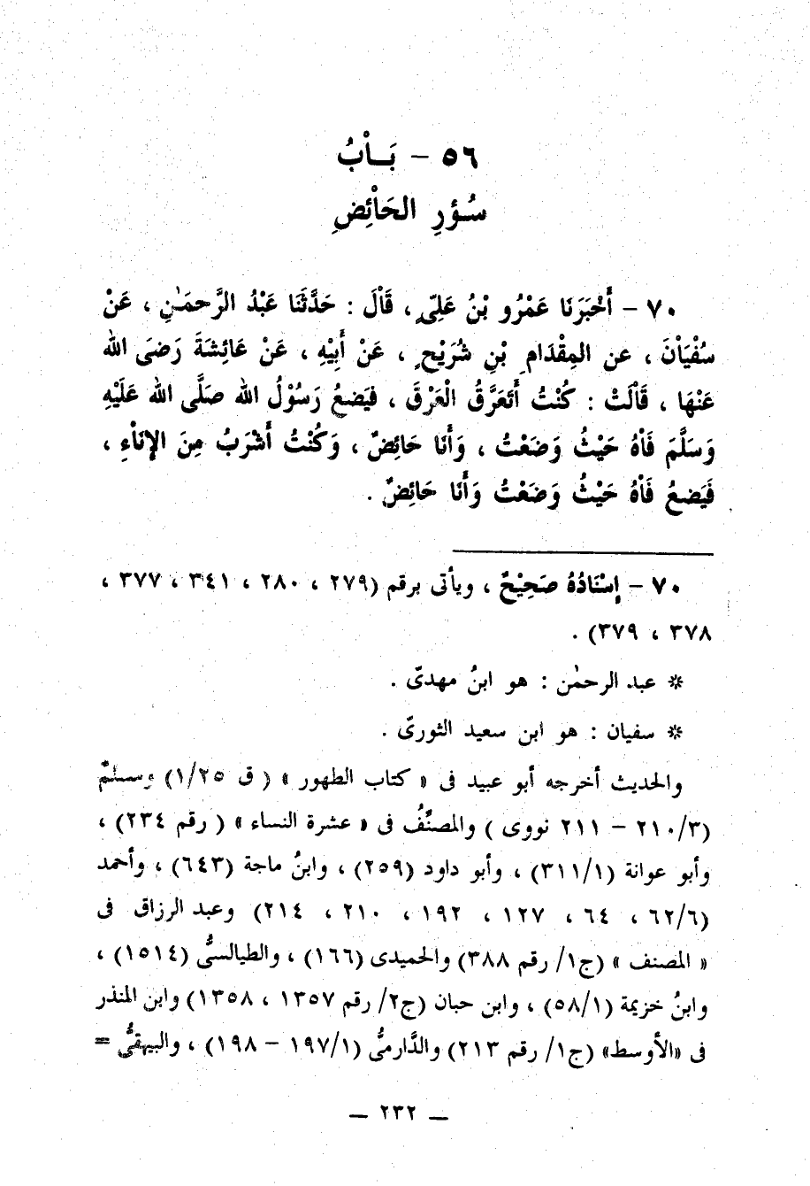والحديث أخرجه أبو عبيد في "كتاب الطهور" (ق 125/ 1) ومسلمٌ (3/ 210 - 211 نووي) والمصنِّفُ في "عشرة النساء" (رقم 234)، وأبو عوانة (1/ 311)، وأبو داود (259)، وابنُ ماجة (643)، وأحمد (6/ 62، 64، 127، 192، 210، 214) وعبد الرزاق في "المصنف" (ج 1/ رقم 388) والحميدى (166)، والطيالسيُّ (1514)، وابنُ خزيمة (1/ 58) وابن حبان (ج 2/ رقم 1357، 1358) وابن المنذر في "الأوسط" (ج 1/ رقم 213) والدَّارميُّ (1/ 197 - 198)، والبيهقيُّ =