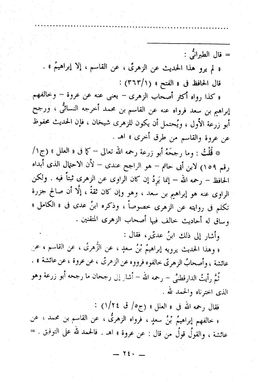 * قُلْتُ: وما رجحَهُ أبو زرعة رحمه الله تعالى -كما في "العلل" (ج 1/ رقم 159) لابن أبي حاتم -هو الراجح عندى- لأن الاحتمال الذي أبداه الحافظ - رحمه الله - إنما يَرِدُ إن كان الراوى عن الزهري ثبتًا فيه. ولكن الراوى عنه هو إبراهيم بن سعد، وهو وإن كان ثقةً، إلا أن صالح جزرة تكلم في روايته عن الزهري خصوصًا، وذكره ابنُ عدي في "الكامل" وساق له أحاديث خالف فيها أصحاب الزهرى المتقنين.