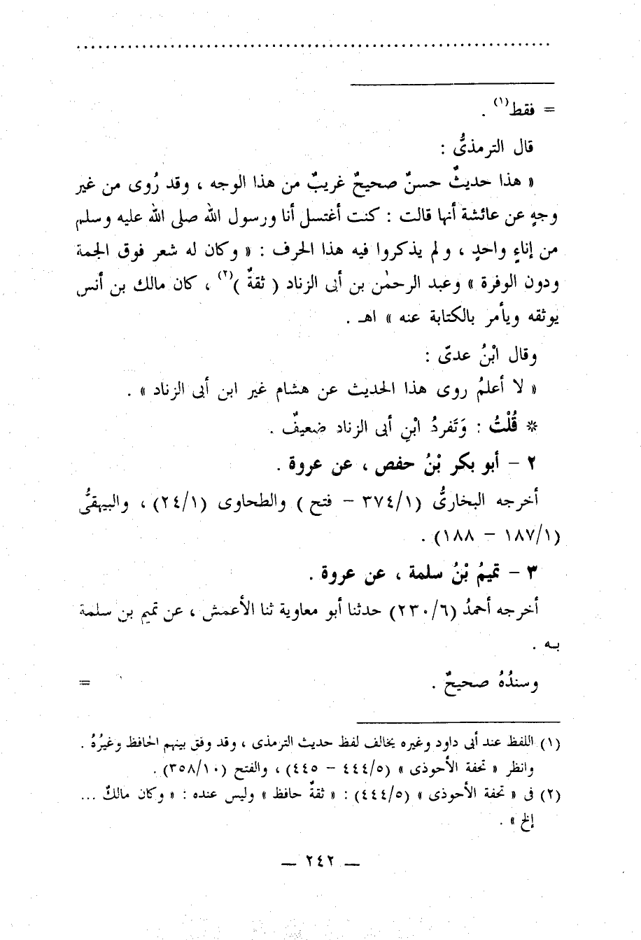 "هذا حديثٌ حسنٌ صحيحٌ غريبٌ من هذا الوجه، وقد رُوى من غير وجهٍ عن عائشة أنها قالت: كنت أغتسل أنا ورسول الله صلى الله عليه وسلم من إناءٍ واحدٍ، ولم يذكروا فيه هذا الحرف: "وكان له شعر فوق الجمة، ودون الوفرة" وعبد الرحمن بن أبي الزناد (ثقةٌ) (¬2)، كان مالك بن أنس يوثقه ويأمر بالكتابة عنه" اهـ.