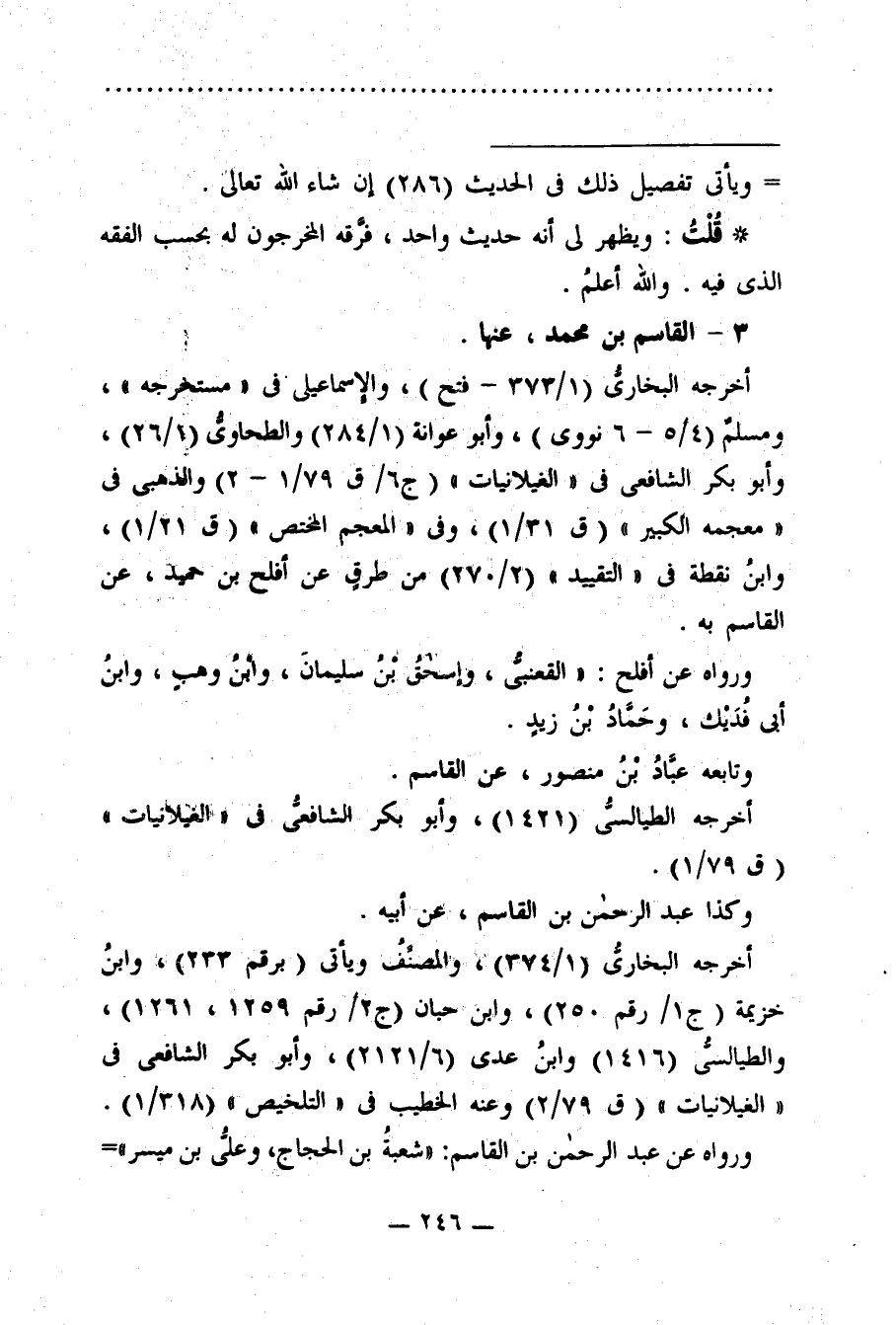 أخرجه البخاريُّ (1/ 373 - فتح)، والإسماعيلي في "مستخرجه"، ومسلمٌ (4/ 5 - 6 نووى)، وأبو عوانة (1/ 284) والطحاويُّ (1/ 26)، وأبو بكر الشافعى في "الغيلانيات" (ج 6/ ق 79/ 1 - 2) والذهبى في "معجمه الكبير" (ق 31/ 1)، وفي "المعجم المختص" (ق 21/ 1)، وابنُ نقطة في "التقييد" (2/ 270) من طرقٍ عن أفلح بن حميد، عن القاسم به.
