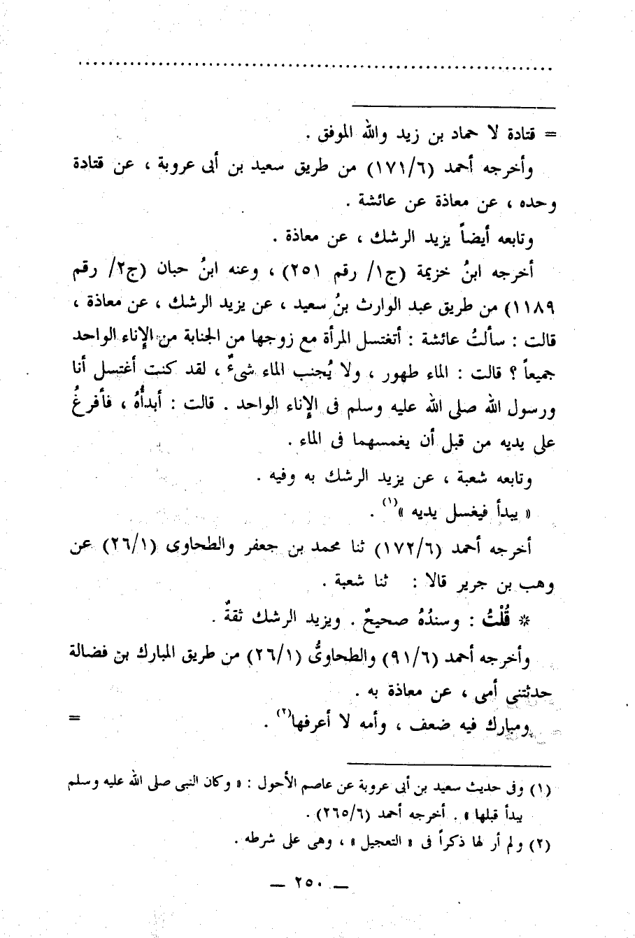 أخرجه ابنُ خزيمة (ج 1/ رقم 251)، وعنه ابنُ حبان (ج 2/ رقم 1189) من طريق عبد الوارث بنُ سعيد، عن يزيد الرشك، عن معاذة، قالت: سألتُ عائشة: أتغتسل المرأة مع زوجها من الجنابة من الإناء الواحد جميعًا؟ قالت: الماء طهور، ولا يُجنب الماء شىءٌ، لقد كنت أغتسل أنا ورسول الله - صلى الله عليه وسلم - في الإناء الواحد. قالت: أبدأْهُ، فأفرغُ على يديه من قبل أن يغمسهما في الماء.