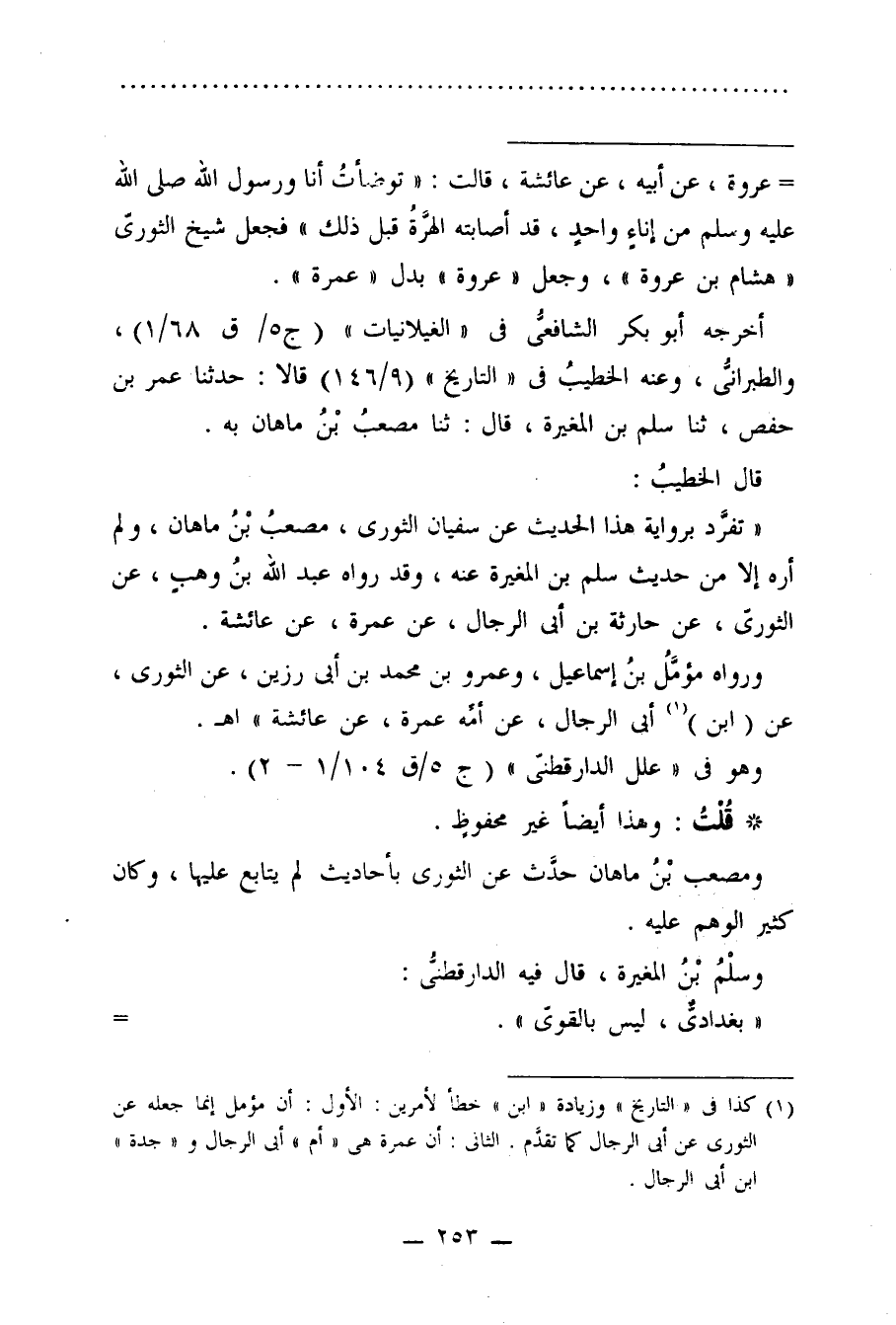"تفرَّد برواية هذا الحديث عن سفيان الثورى، مصعبُ بْنُ ماهان، ولم أره إلا من حديث سلم بن المغيرة عنه، وقد رواه عبد الله بنُ وهبٍ، عن الثورىّ، عن حارثة بن أبي الرجال، عن عمرة، عن عائشة.