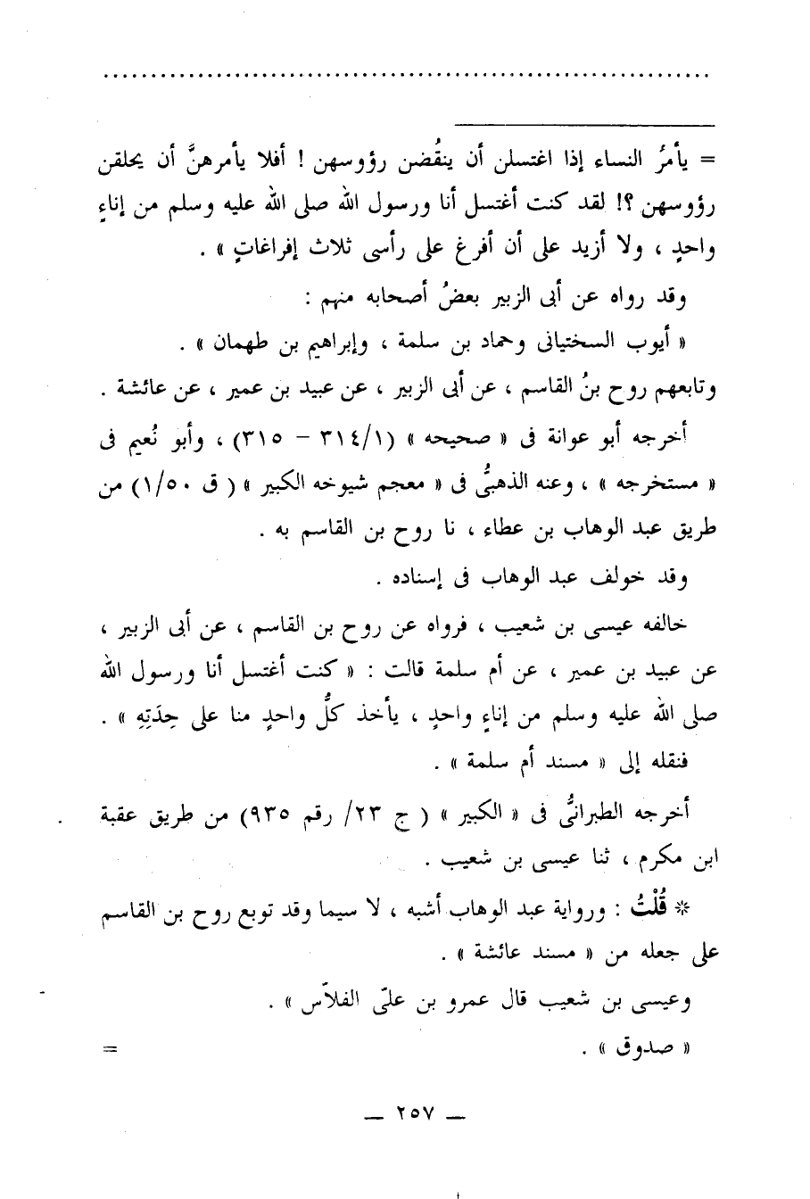 = يأمرُ النساء إذا اغتسلن أن ينقُضن رؤوسهن! أفلا يأمرهنَّ أن يحلقن رؤوسهن؟! لقد كنت أغتسل أنا ورسول الله صلى الله عليه وسلم من إناءٍ واحدٍ، ولا أزيد على أن أفرغ على رأسي ثلاث إفراغاتٍ".