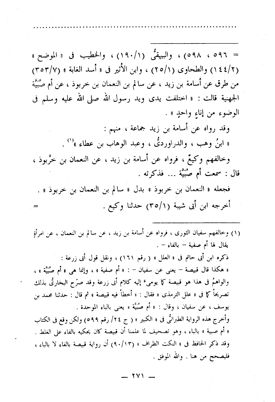 (¬1) خالفهم سفيان الثورى، فرواه عن أسامة بن زيد، عن سالم بن النعمان، عن امرأةٍ يقال لها أم صفية -بالفاء-.