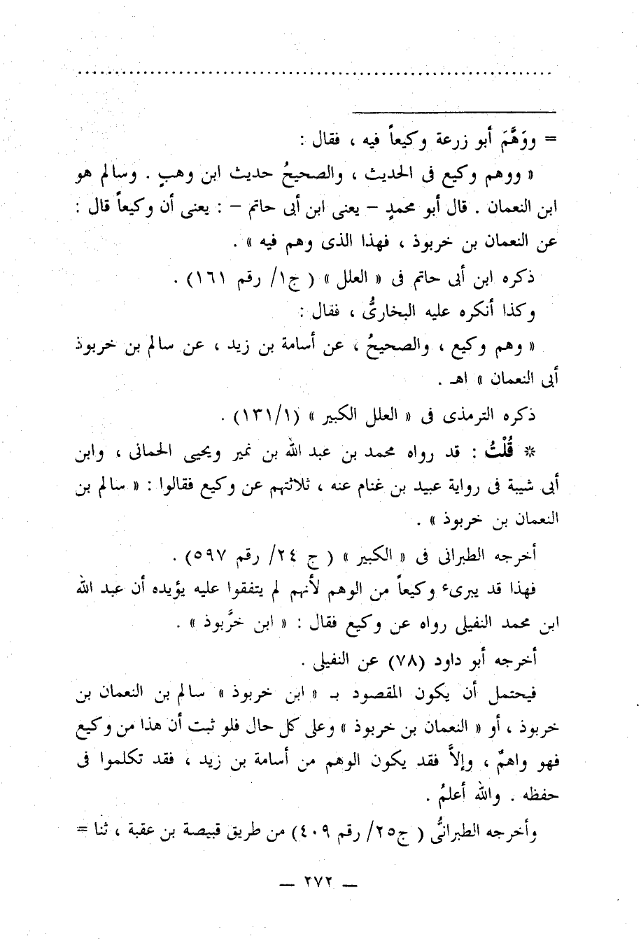 "ووهم وكيع في الحديث، والصحيحُ حديث ابن وهبٍ. وسالم هو ابن النعمان. قال أبو محمدٍ -يعني ابن أبي حاتم-: يعني أن وكيعًا قال: عن النعمان بن خربوذ، فهذا الذي وهم فيه".
